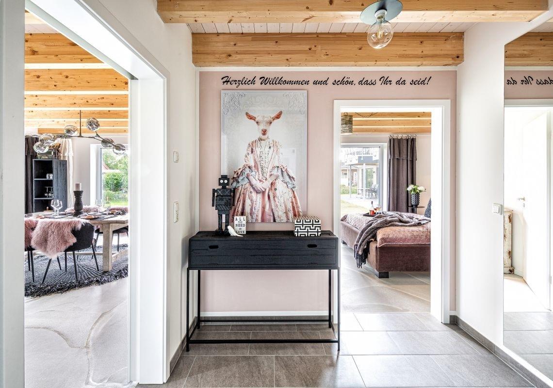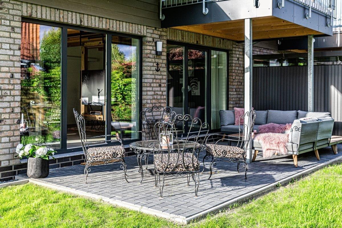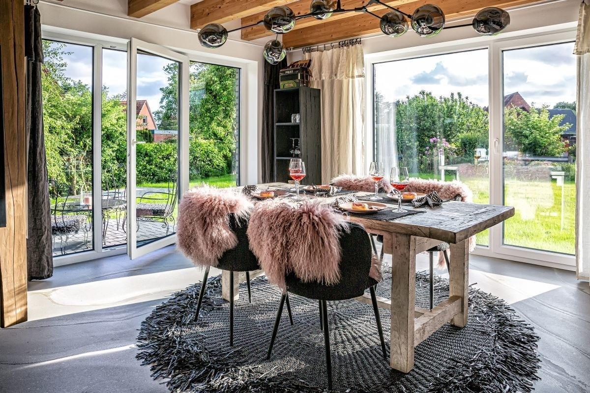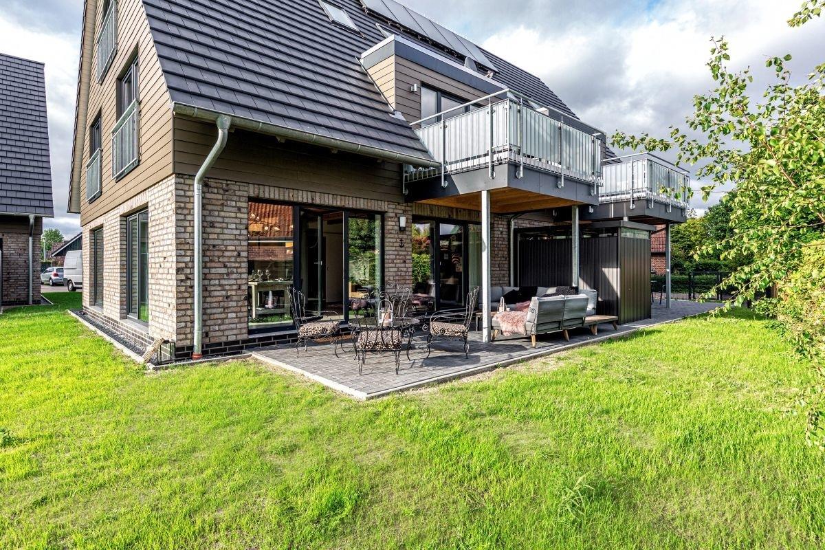 Im Wohnzimmer lädt das grosse Schlafsofa mit einer Liegefäche von 1,60x2,00m zu gemütlichen Stunden ein. Oder doch lieber Kochen und Klönen in der wunderbaren Küche mit Blick aus den bodentiefen Fenstern dieses tollen Neubaus in den Garten?