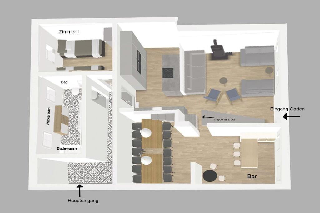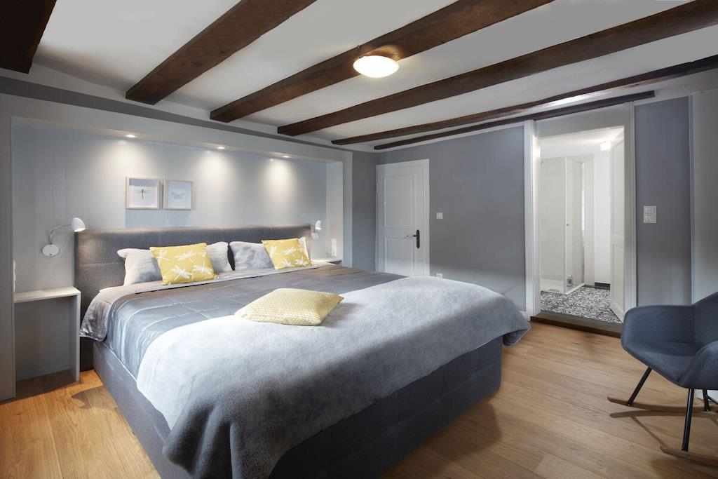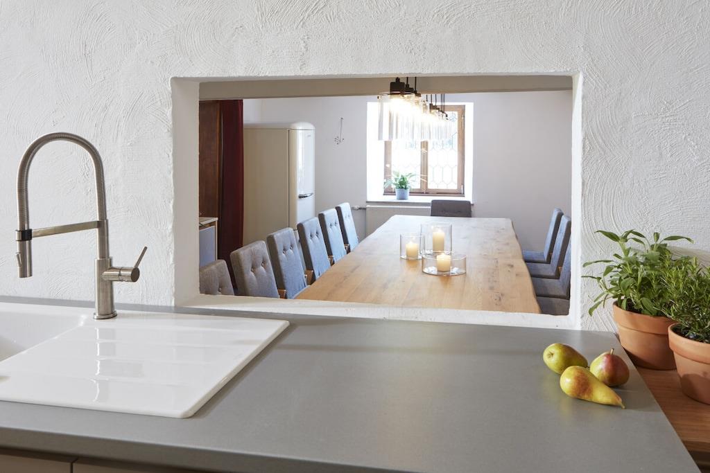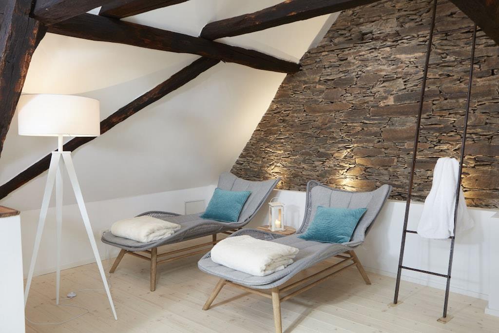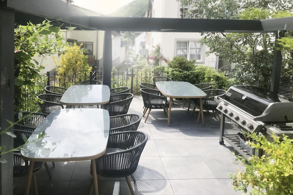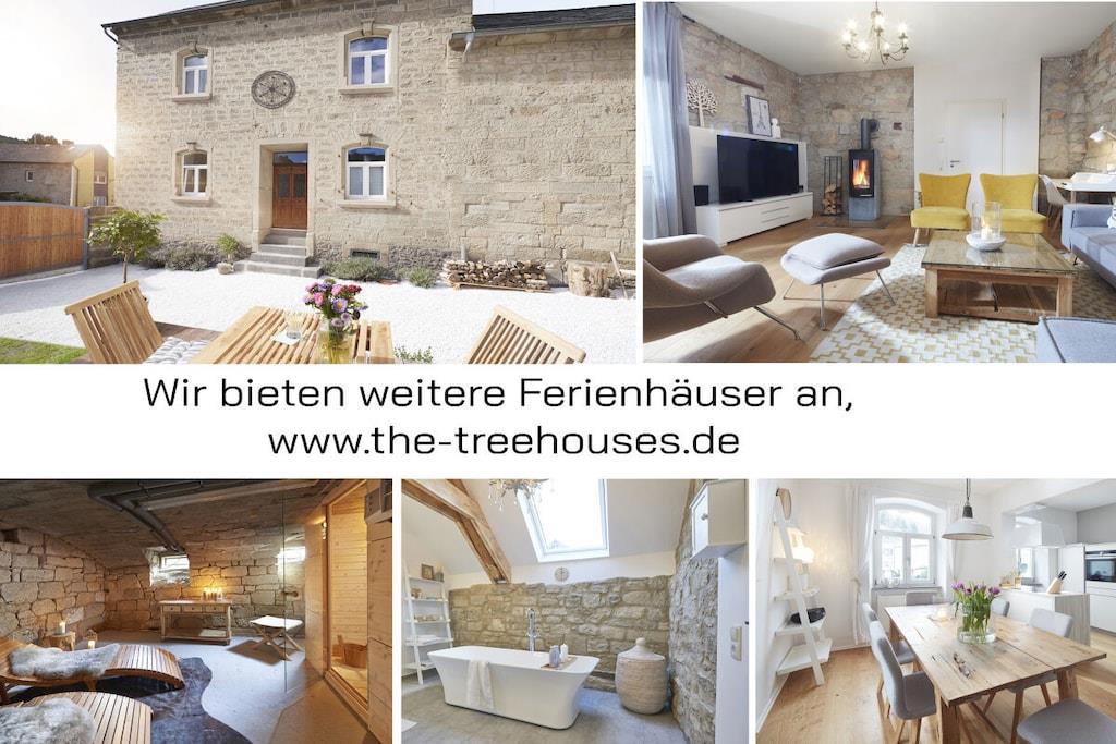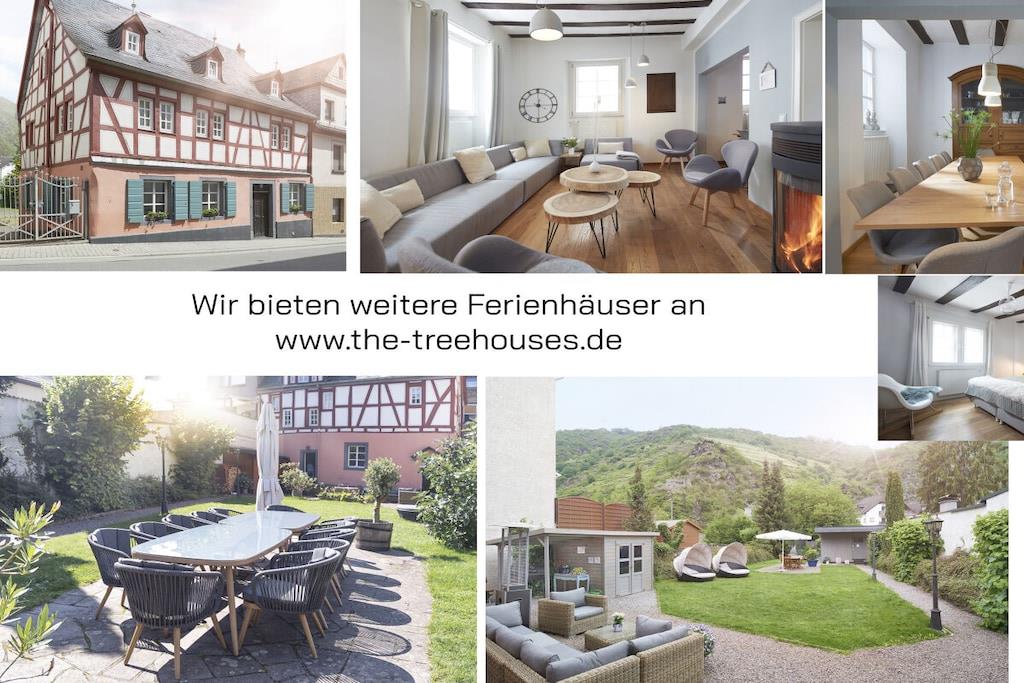 OLIVE TREE FERIEHUS Priserne for Traum-Ferienwohnungen inkluderer altid 8 personer. Da vi ikke kan variere minimumsbelægningen på denne portal i de forskellige årstider, vil vi gerne gøre dig opmærksom på, at du om vinteren og i pauser i løbet af ugen også kan booke til reducerede priser for 6 personer eller flere. Yderligere information kan findes på vores hjemmeside: www.the-treehouses.de Eksklusive tjenester: Uanset om det er vinsmagning, massage, privat kok eller catering, kan du blot booke yderligere specialtjenester. Du har mulighed for at føle dig hjemme i en fredet bygning, oprindeligt bygget i 1595 i Bullay som den aristokratiske residens "Pauly". Olive Tree blev restaureret og fuldstændig renoveret indtil september 2020. Den seneste renovering fandt sted i 2022. Feriehuset er kendetegnet ved en kombination af moderne møbler og husets historiske stil. Ud over andre historiske træk pryder et kölnsk spejlrelief-stukloft et af soveværelserne. Med 7 soveværelser, 6 badeværelser og et stort fællesrum med spisestue, stue, åbent køkken, en smuk bar og et 50 kvadratmeter stort saunaområde er dette feriehus ideelt til familier og venner eller firmaarrangementer. Indvendigt er meget af den oprindelige struktur bevaret, såsom et loft med spejlrelief i Köln-stil. Vi har kombineret dette historiske hus med moderne møbler. Huset har en smukt anlagt, solbeskinnet have med en stor terrasse og et havebord til op til 15 siddepladser. Der er også flere ekstra siddeområder samt et loungeområde. En legeplads ligger mindre end 100 meter væk, direkte ved Mosel-floden.