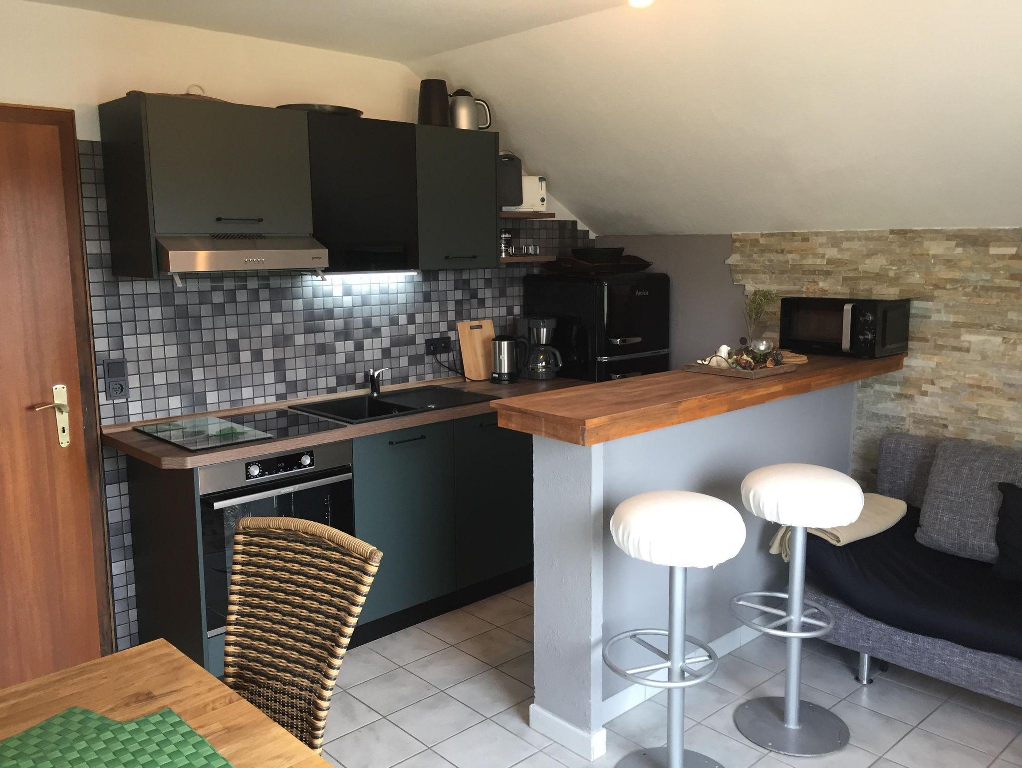 • Wohnküche mit Schlafcouch, Kühl/Gefrierkombination, Mikrowelle und Essgruppe.