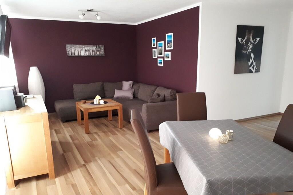 Die im Oktober 2018 renovierte Ferienwohnung befindet sich im Erdgeschoss einer exklusiven Doppelhaushälfte (Neubau 2010). Es erwartet Sie eine 65qm große Ferienwohnung mit einer herrlichen Süd-Terrasse. Die 2 separaten Schlafzimmer sind mit einem Doppelbett für die Eltern, und einem Etagenbett für Ihre "Kleinen" ausgestattet. Für die ganz kleinen steht natürlich auch eine Wickelkommode bereit. Das modern eingerichtete Badezimmer ist mit ebenerdiger Dusche, Toilette & Waschbecken ausgestattet. Der geräumige, offen gestaltete, Wohn-/Küchenbereich ist das Herzstück dieser Wohnung. Hier können Sie auf ca. 35qm Fläche ausspannen oder nach Herzenslust schlemmen. Denn in der vollausgestatteten Küche mit u. a. Mikrowelle, Kühlschrank m. Gefrierfach, Herd m. Backofen u. Cerankochfeld, Spülmaschine wird das Kochen zum Vergnügen. Durch die zentrale, aber dennoch ruhige Lage bietet sich die Wohnung als Ausgangspunkt für Radtouren bestens an.