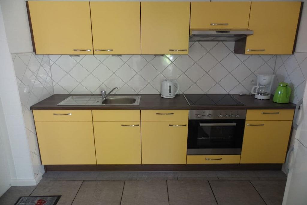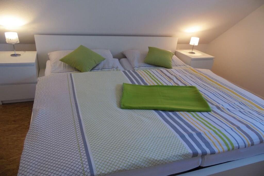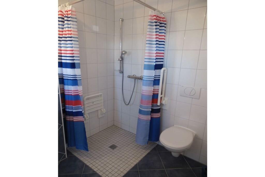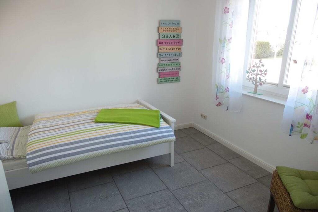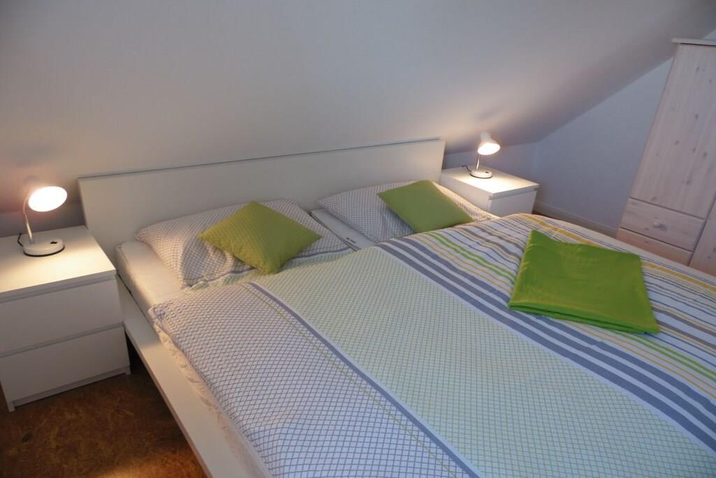 Das Ferienhaus erstreckt sich über zwei Etagen. Im Erdgeschoss befindet sich ein behinderten geeignetes Badezimmer mit rollstuhlbefahrbarer Dusche und WC. Ebenfalls ist das Einzelschlafzimmer im EG. Ein großzügiger Wohn-u. Essbereich mit direktem Ausgang auf die sonnige Terrasse und Garten hat den größten Anteil in der unteren Etage. Sehr schön ist die separate Küche mit Nebeneingangstür zum Carport. Gepäck und Einkäufe können so trockenen Fußes ins Haus gebracht werden. Im Dachgeschoß befinden sich 3 weitere Schlafzimmer und ein Badezimmer mit Dusche und Badewanne, sowie ein Abstellraum für Ihre Koffer. Die Schlafzimmer sind allesamt mit gemütlichen Doppelbetten ausgestattet. Ein Schlafzimmer hat zusätzlich einen Fernseher mit Flachbildschirm.