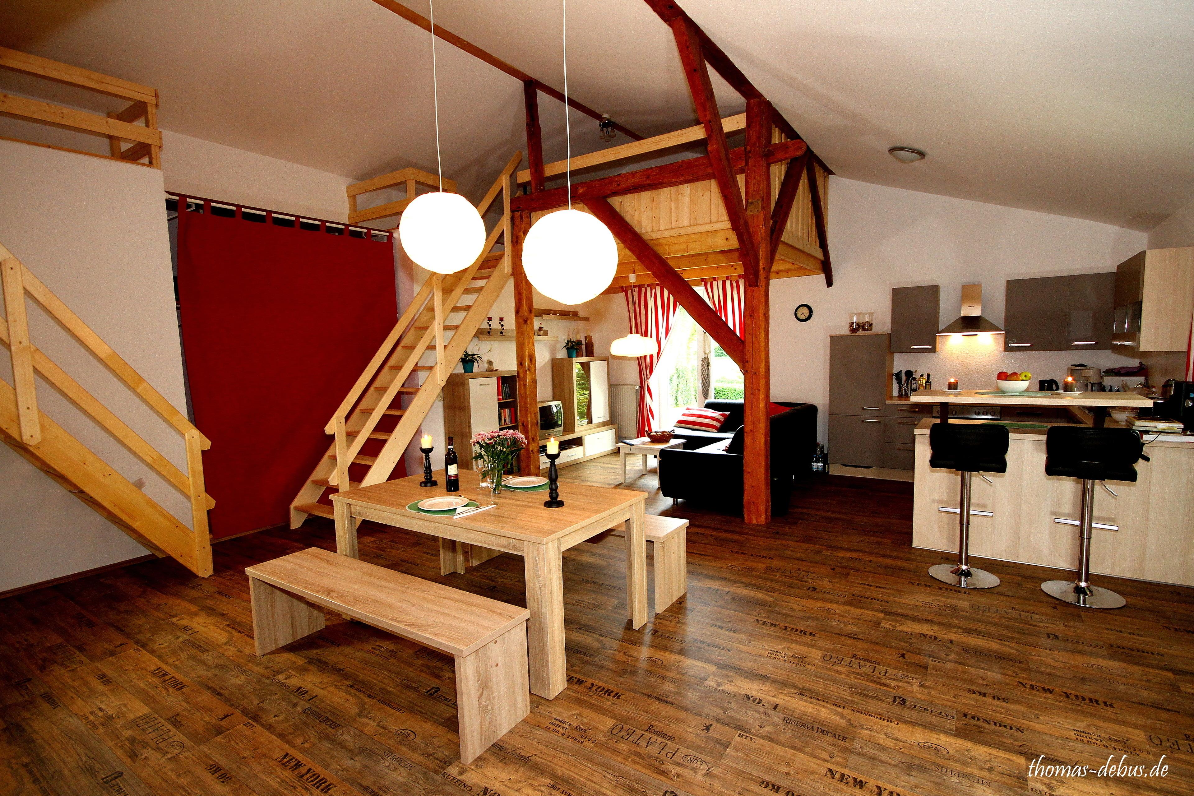 In unserer großen Ferienwohnung können bis zu 6 Personen untergebracht werden und sie ist in einem ganz eigenem Flair gestaltet. Der offene Wohnbereich ist mit viel Liebe zum Detail eingerichtet worden. Das Badezimmer ist schön geräumig und die Schlafbereiche sind einfach nur schön.