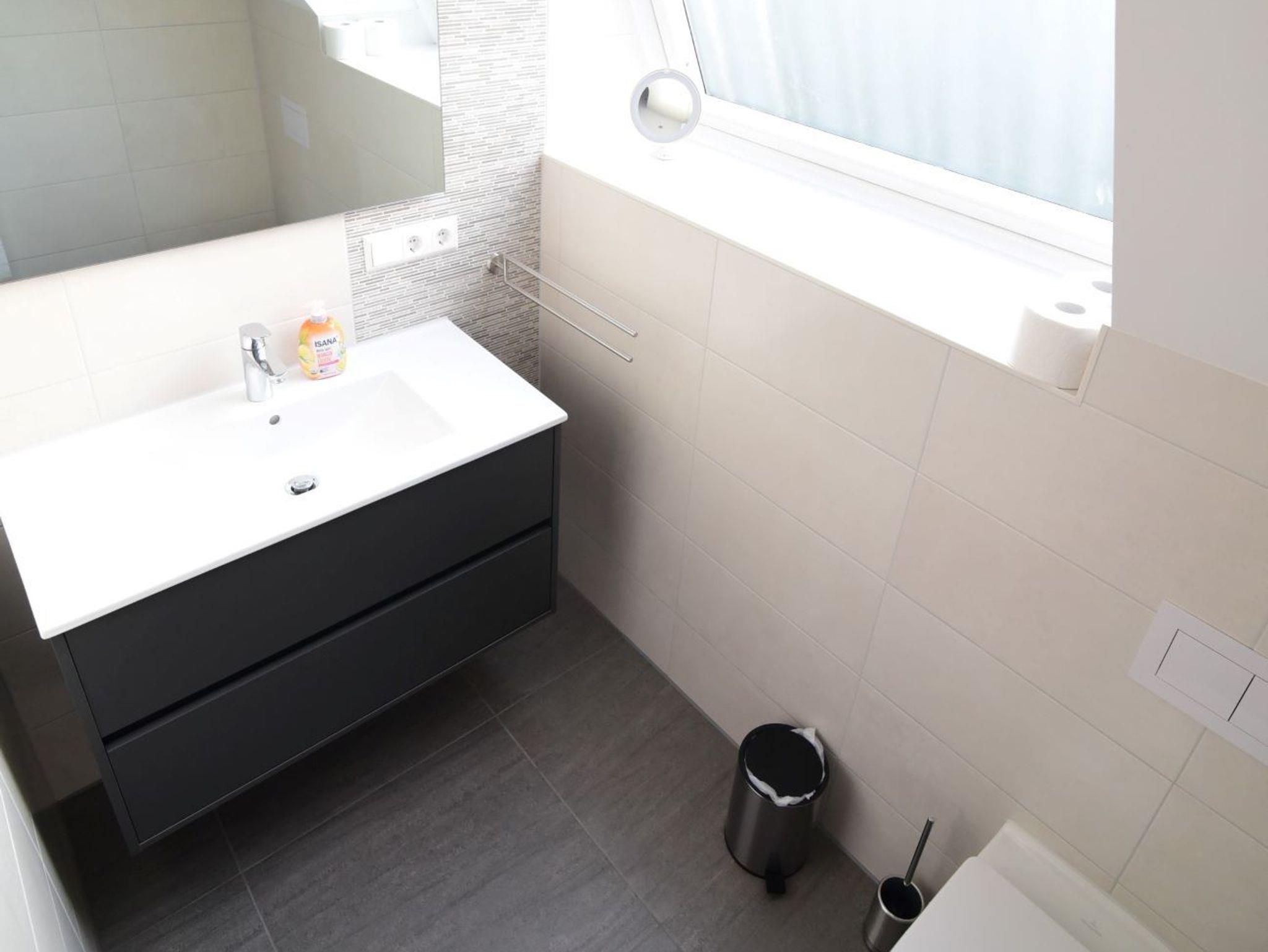 Das hellgeflieste Bad ist mit einer ebenerdigen Dusche, einem Waschtisch mit Wandspiegel, einem Haartrockner und einer Toilette ausgestattet.