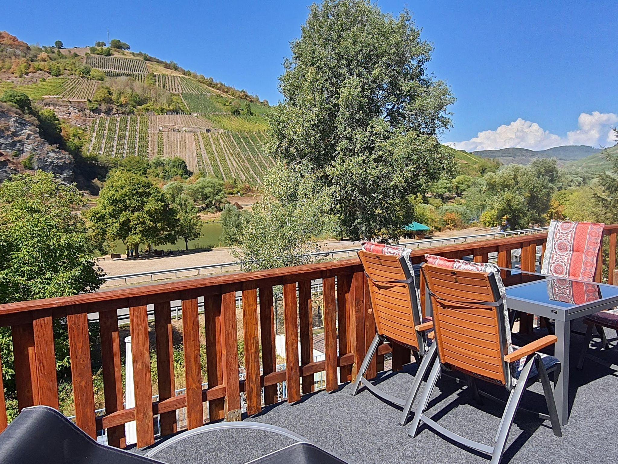 Dieser Blick ist auch von der Terasse aus der Ferienwohnung Zum Moselfischer zu genießen. Die so groß ist das ich darauf Essen und relaxen kann. Von der Ferienwohnung bin ich in wenigen Gehminunten an der Bushaltestelle, in den Weinbergen, oder an der Mosel.
