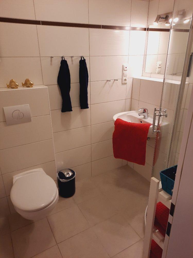 Eckdusche mit Glastüren, Handtuchheizkörper, gute Beleuchtung, viele Aufhängemöglichkeiten und Ablagen, Fön, klappbarer Wäscheständer