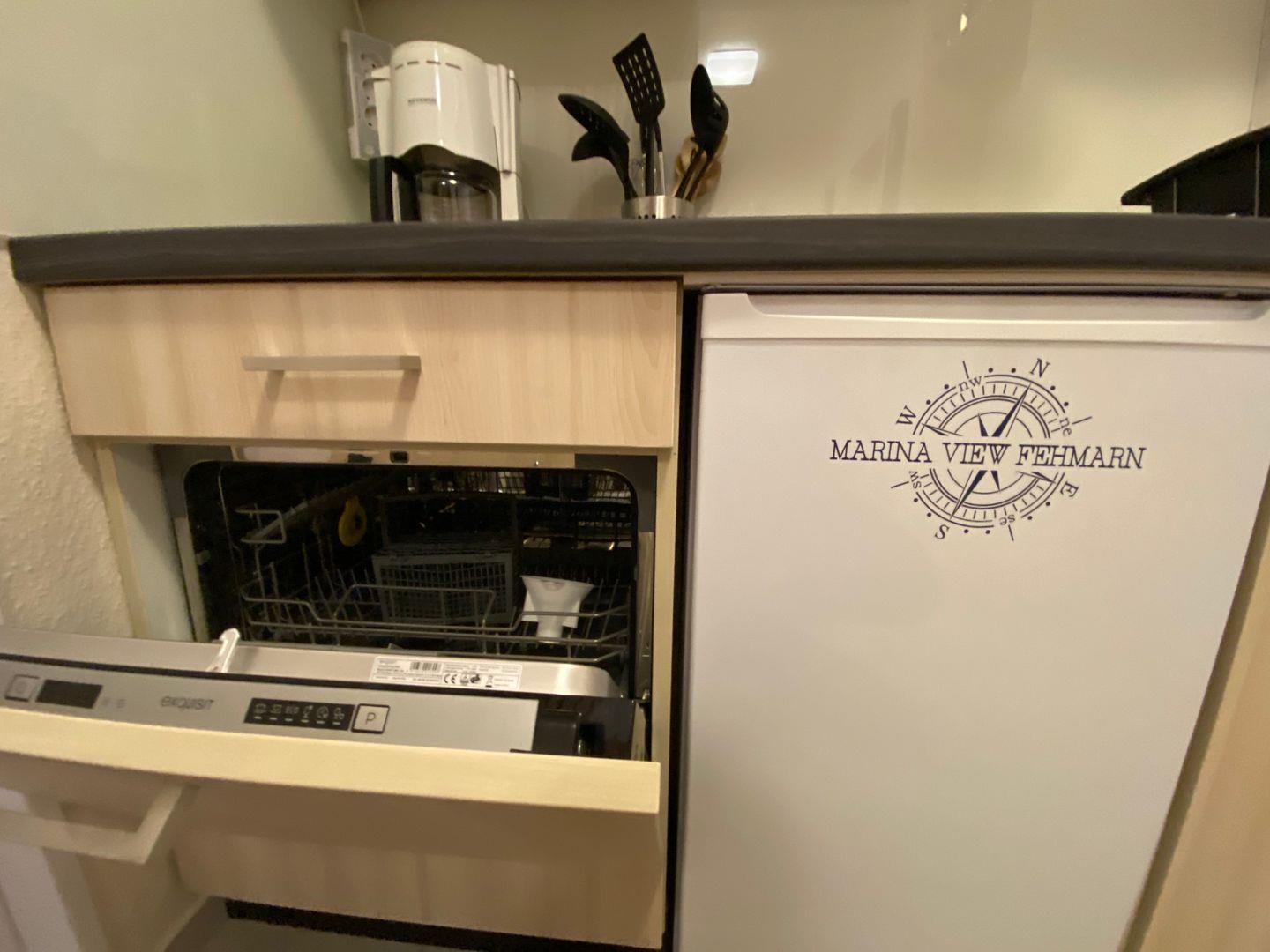 Kühlschrank, Spülmaschine, Mikrowelle mit Grill, Filterkaffeemaschine, 2er Cerankochfeld, Toaster, Wasserkocher, Eierkocher und eine umfangreiche Ausstattung mit Gläsern, Geschirr und Küchenutensilien