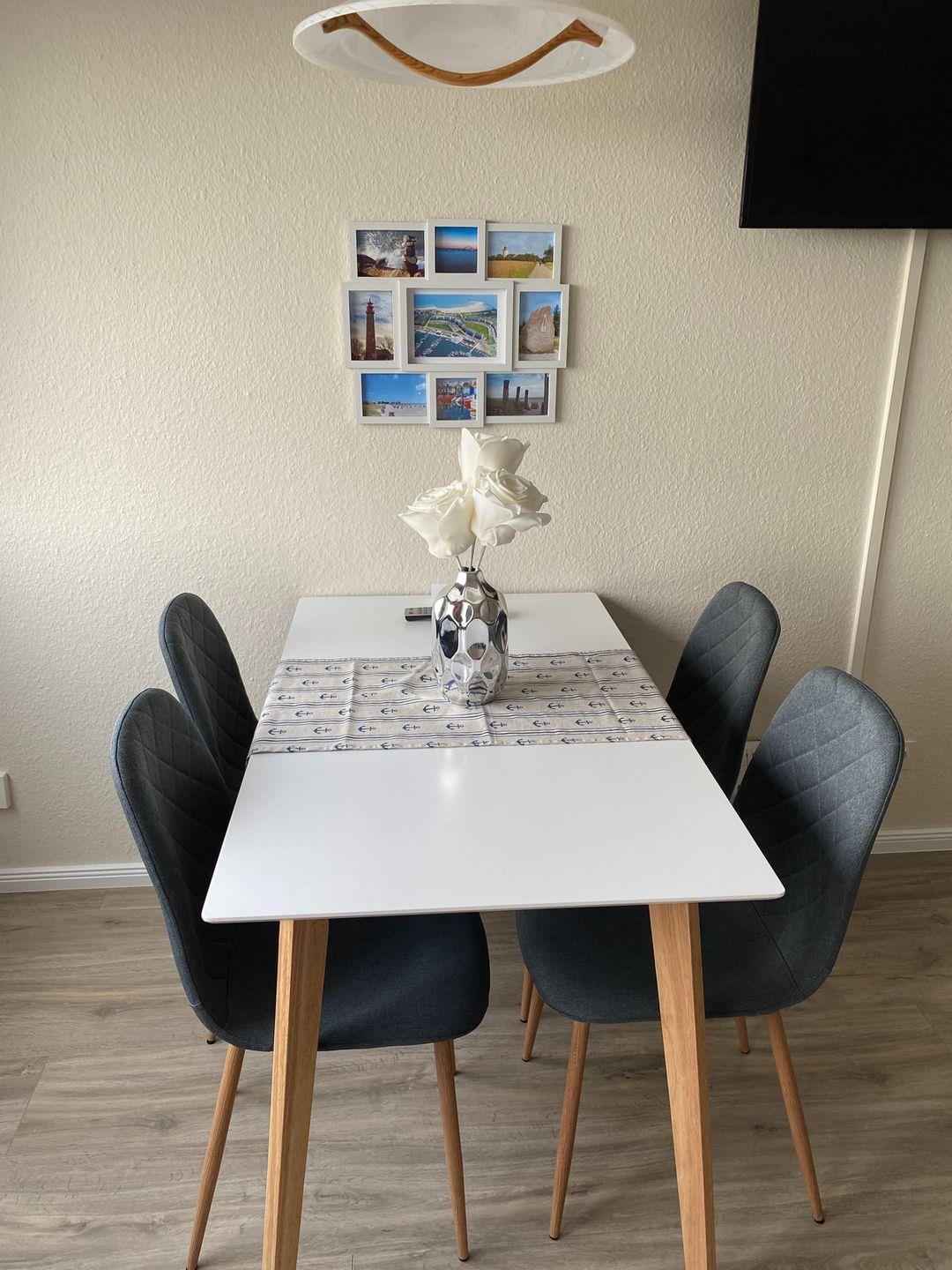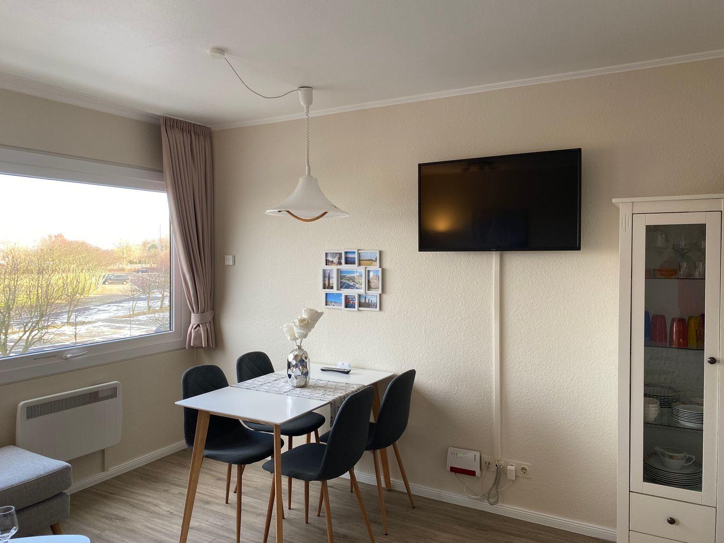 hochwertiges Bett (180x200) mit LED-Leselampen, Flat Screen-TV, 2,5 Sofa, Hocker, LED Deckenfluter mit Leselampe, WLAN, Esstisch mit vier Stühlen, 2türiger Kleiderschrank, Vitrine mit viel Geschirr und Gläsern