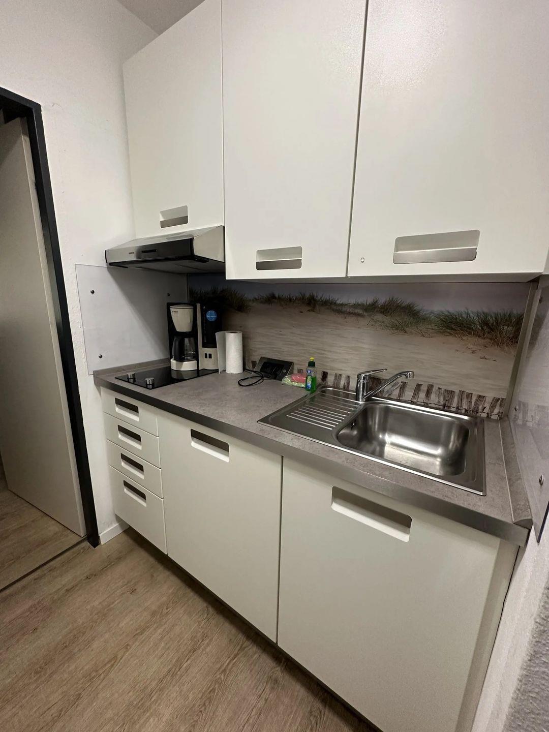 Moderne Einbauküche mit moderner Ausstattung ( Cerankochfeld, Kühlschrank mit Gefrierfach Kaffeemaschine, Wasserkocher, Toaster)