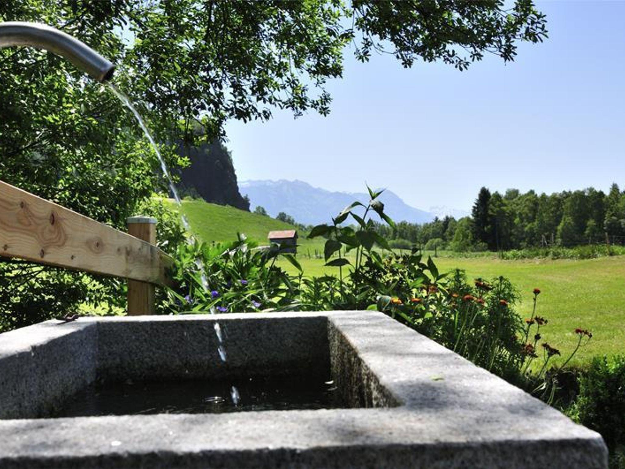 Im Hofgelände laden eine sonnige Sitzecke, ein Naturbächle, ein Kneippbecken mit frischem Quellwasser und eine Terrasse zum Verweilen ein.