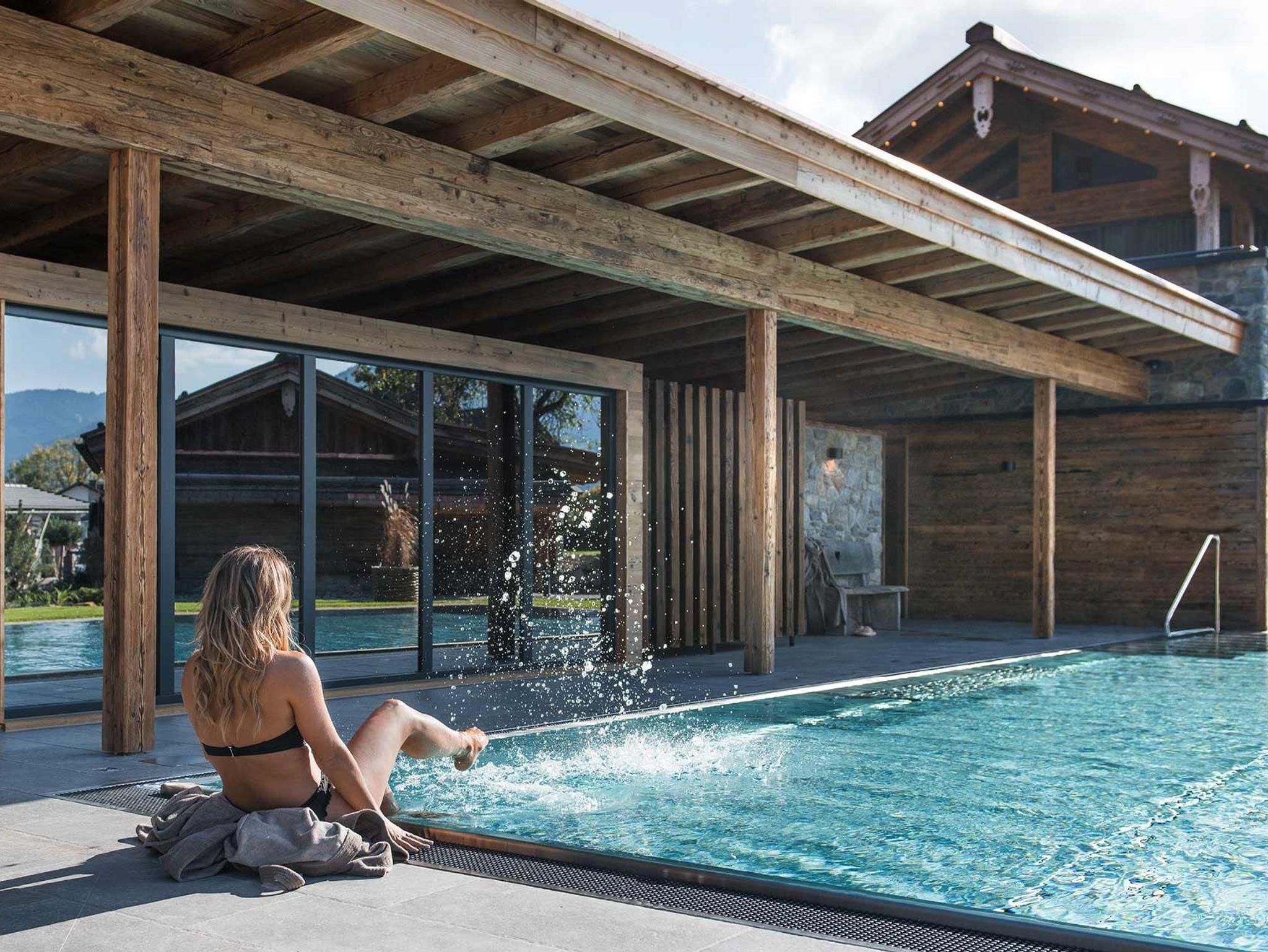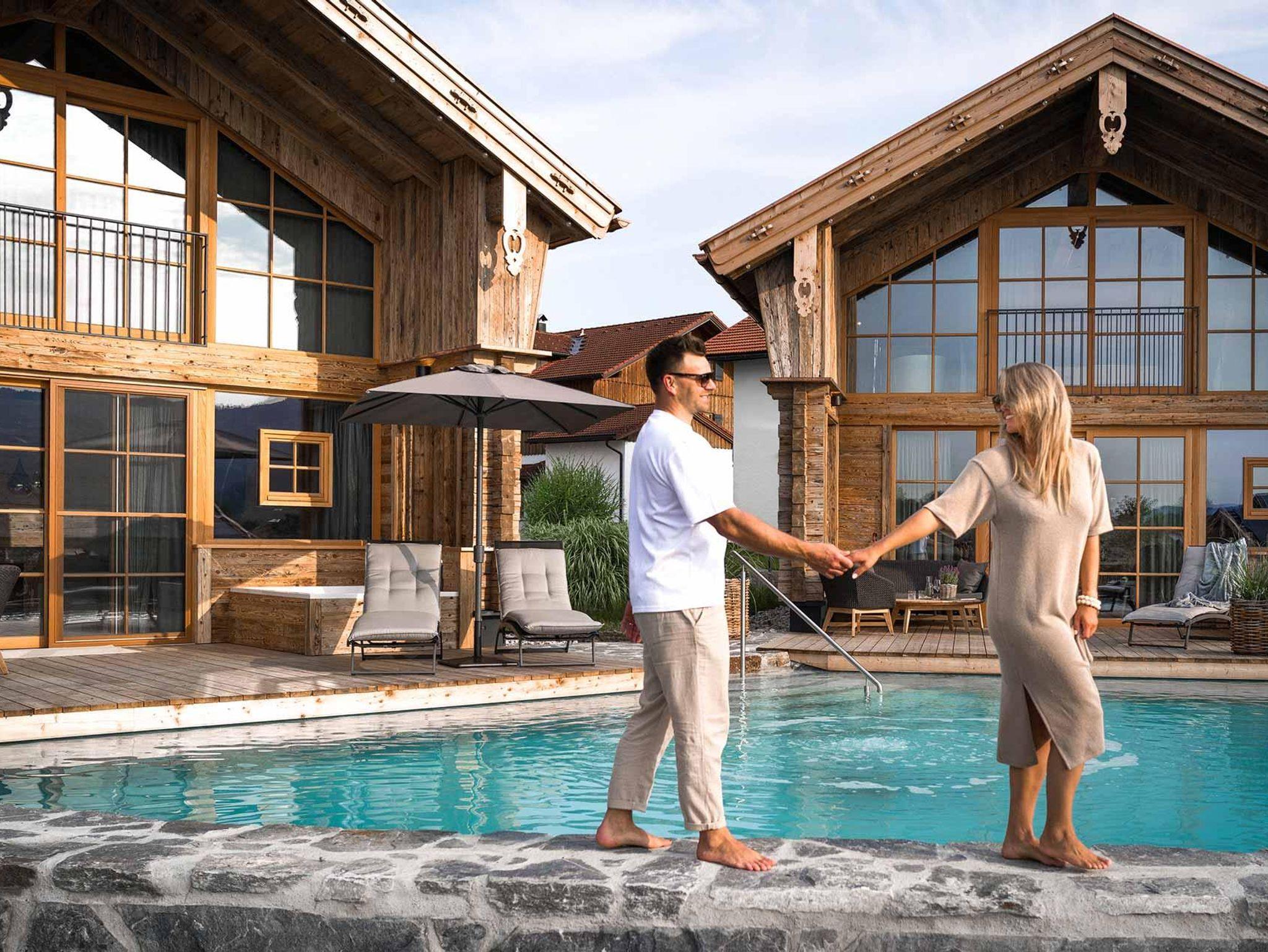 Alle neuen Chalets mit Alpzitt-Besonderheiten und eigenem Whirlpool auf der Terrasse – plus Pool, Naturbadesee & neues Spa-Gebäude.