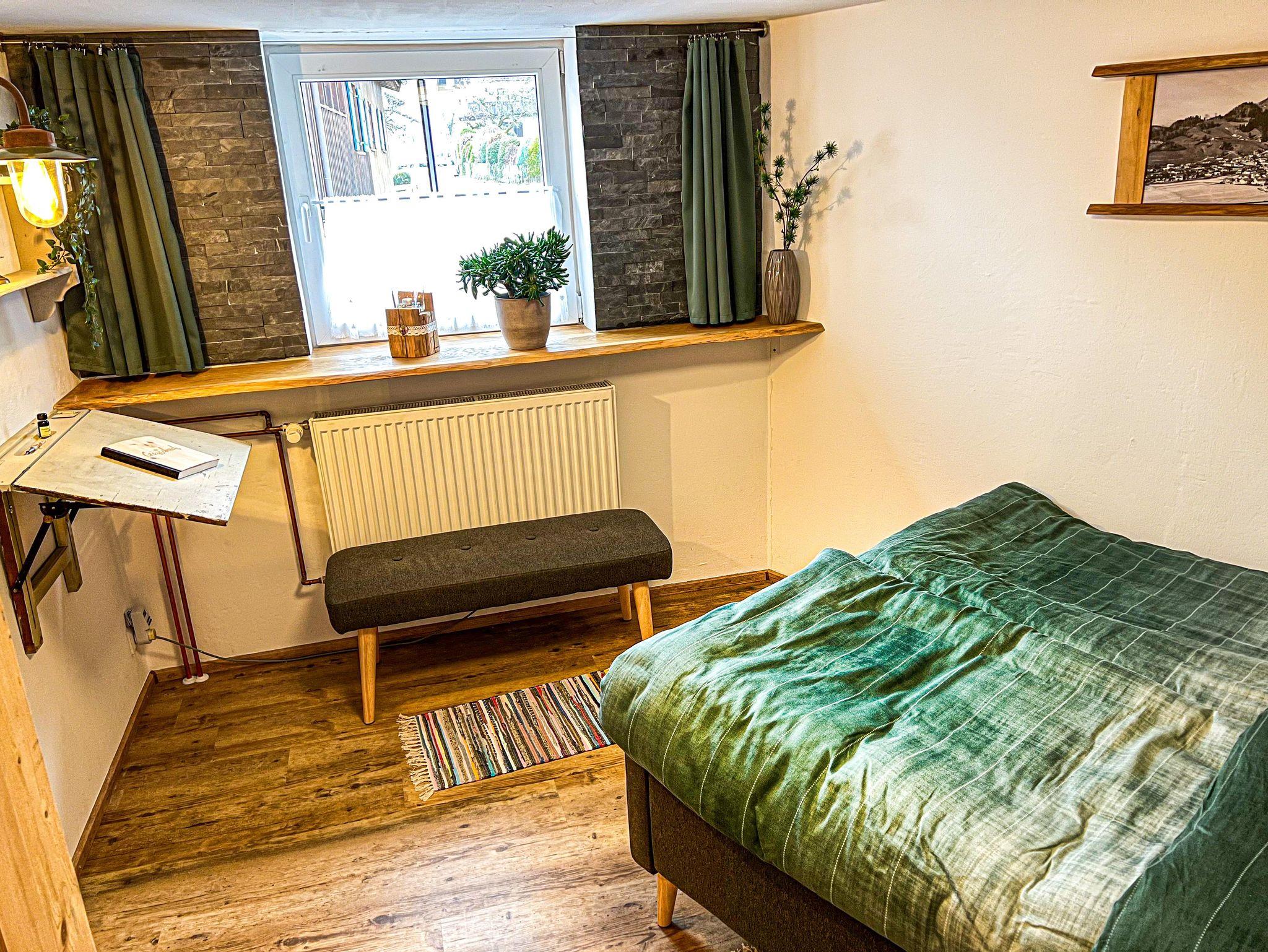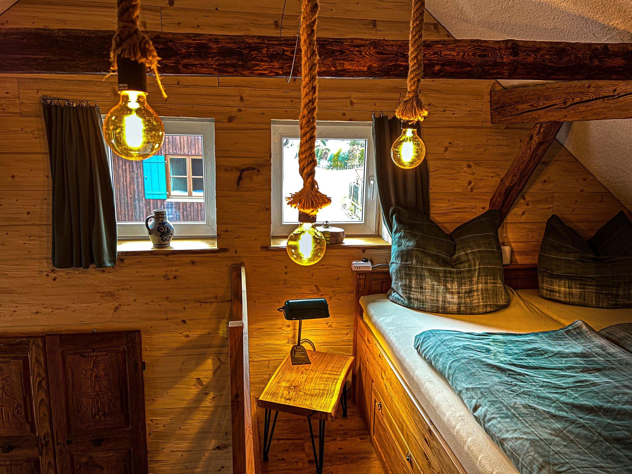 In der oberen Etage der ehemals alten Tenne ist ein separates heimeliges Schlafzimmer integriert, ausgestattet mit einem französischem Bett für zwei weitere Schlafplätze.
