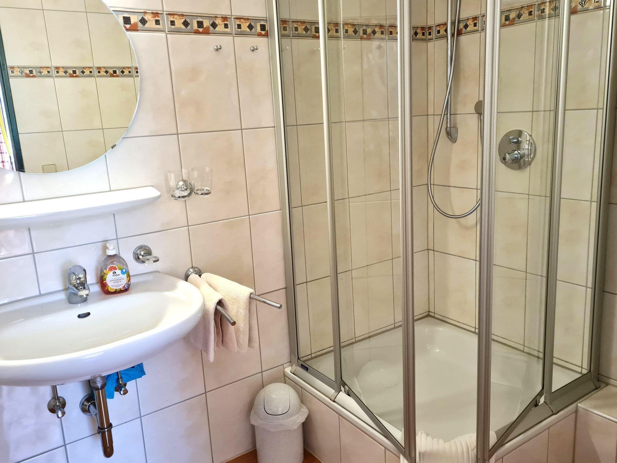 Im Badezimmer befindet sich ein Waschbecken, Dusche und Toilette.
