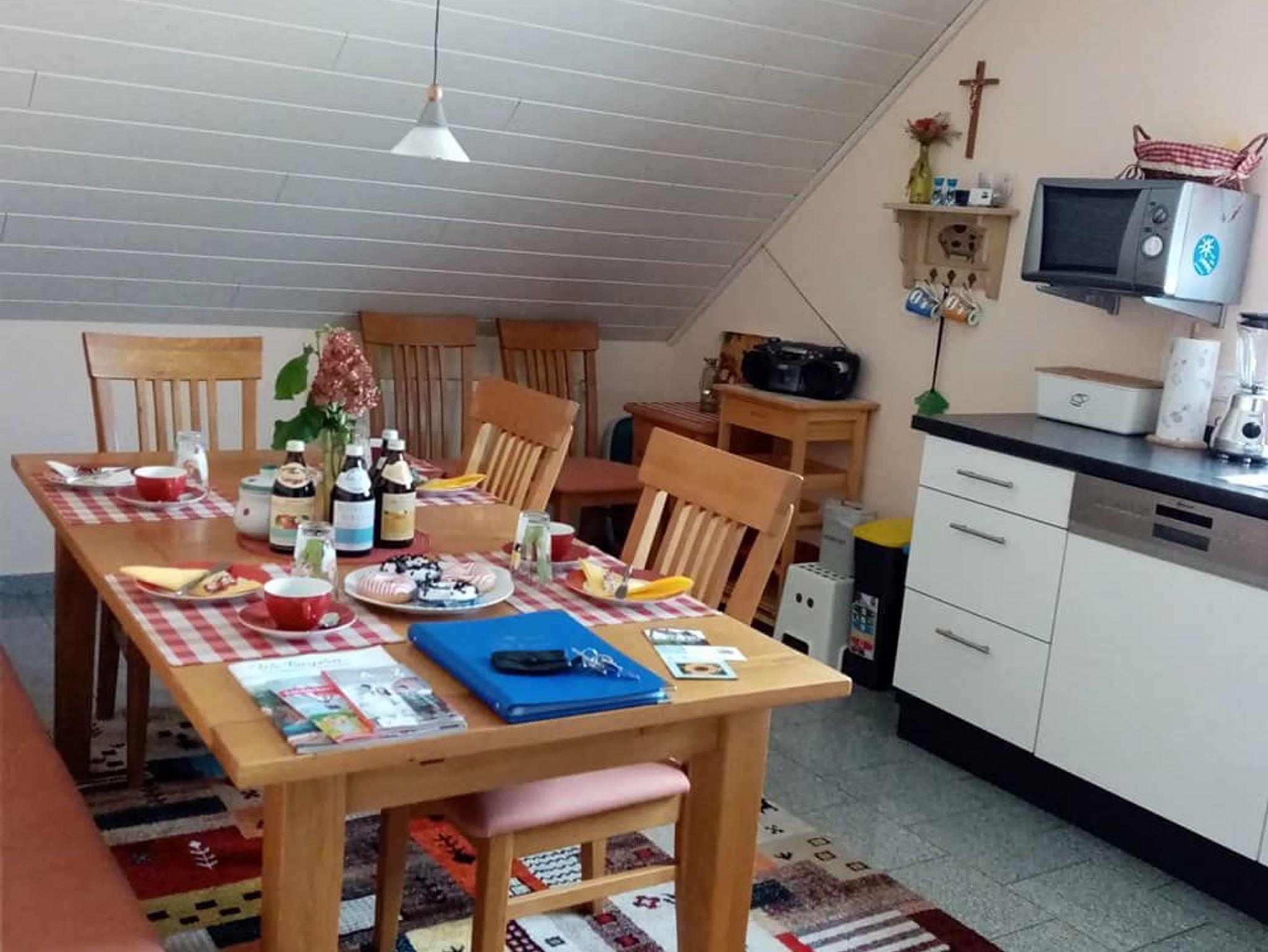 Ferienwohnung mit 2 Schlafzimmer ( Schlafzimmer mit Doppelbett, Schlafzimmer mit Hochbett und Einzelbett), Wohnzimmer mit Ledercouch und Kaminofen, Essküche mit Einbauküche -voll ausgestattet, großes Bad mit Badewanne und Dusche, überdachter Balkon auf dem das Rauchen erlaubt ist.