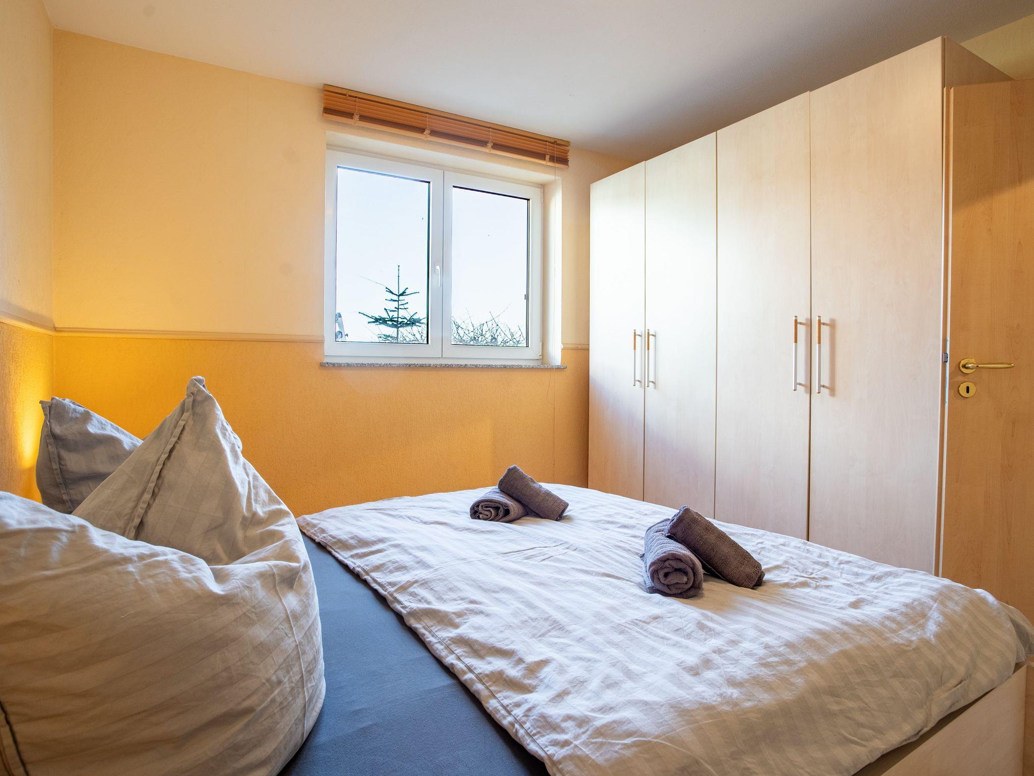 Das separate Schlafzimmer ist mit einem Doppelbett und einem großzügigen Kleiderschrank eingerichtet. Das Badezimmer verfügt über eine Dusche.