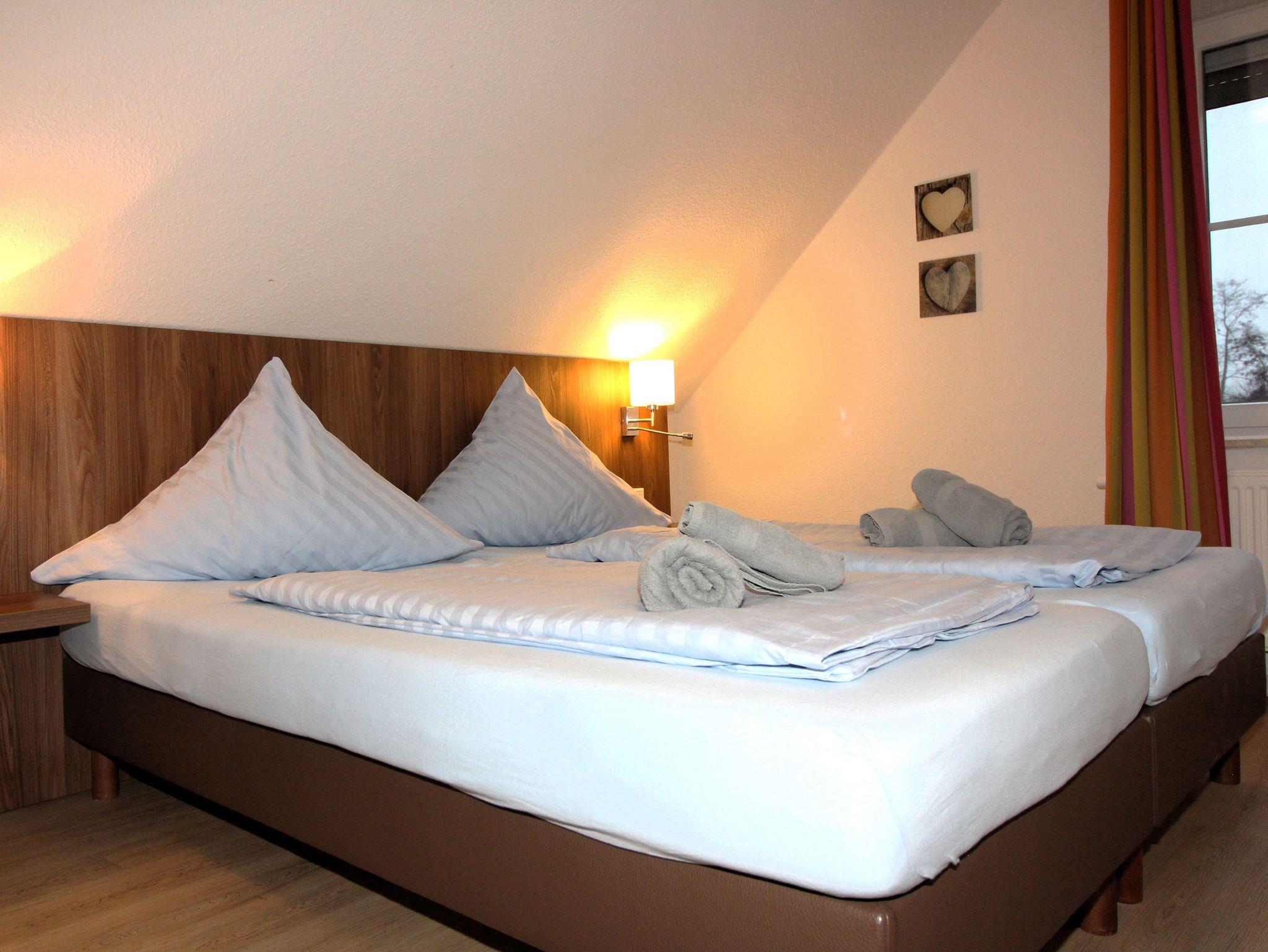 Im Dachgeschoss befindet sich ein weiterer Schlafraum mit zwei getrennten Boxspringbetten, einem Kleiderschrank, einem 26“ LED-Flachbildfernseher und einem Radiowecker.
