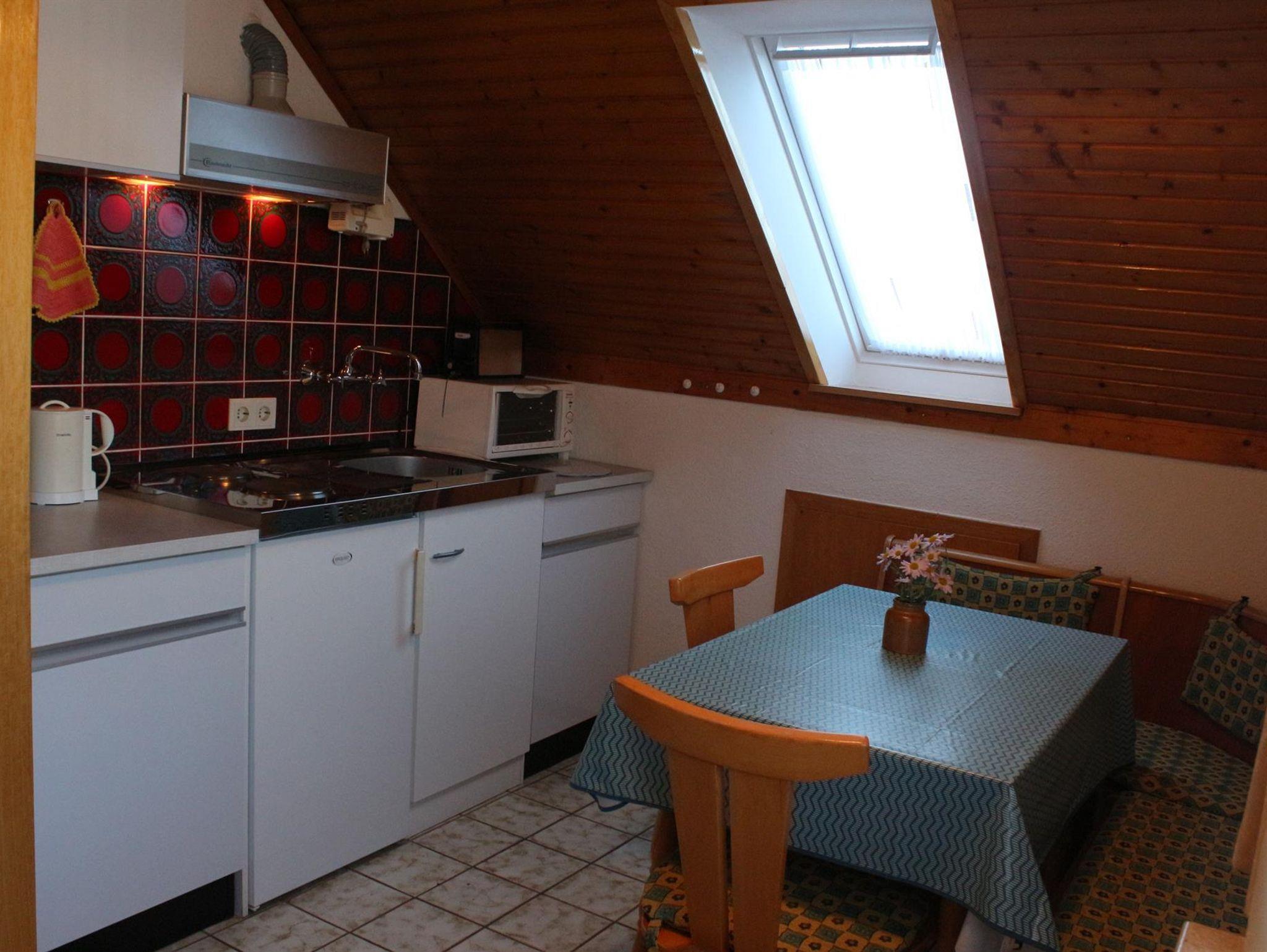 Die Ferienwohnung liegt im 1. Obergeschoss und hat eine Wohnküche mit gemütlicher Sofaecke (Schlafsofa120x200cm), TV, Essecke, und einer Küchenzeile mit Kühlschrank, Mini-Backofen, Kaffeemaschine, Wasserkocher. Ein Schlafzimmer mit Doppelbett und Kleiderschrank und ein Bad mit Dusche, WC und Waschtisch steht Ihnen zur Verfügung. Im Garten finden Sie eine Gemeinschaftsterrasse mit Gartengrill, wo man den Urlaubstag schön ausklingen lassen kann. Ein Fahrradschuppen steht ebenfalls zur Verfügung.