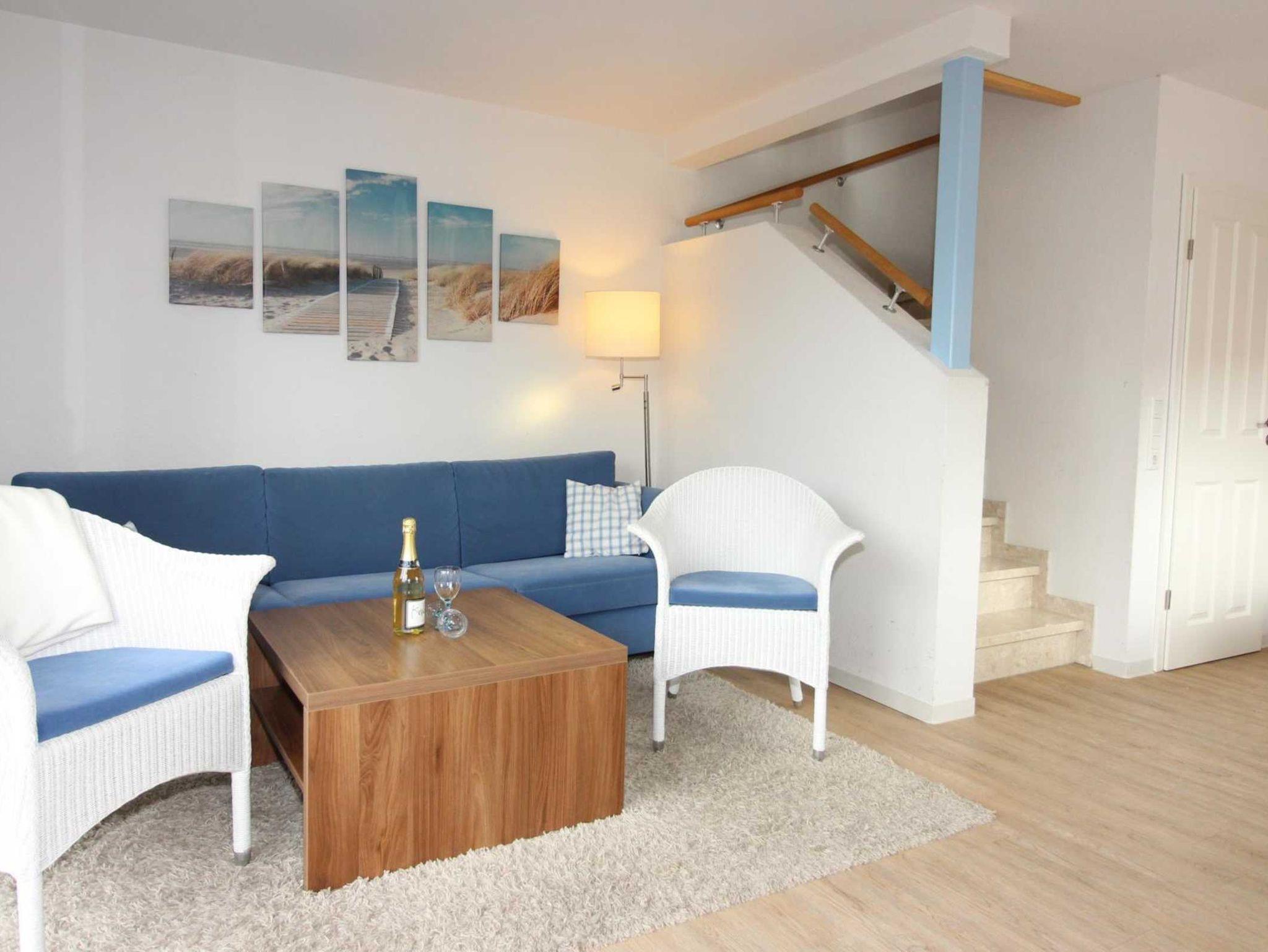 Der Wohnbereich bietet eine Sitzecke mit einem großen Sofa, Couchtisch und zwei Sesseln. Ein Flachbildfernseher, ein DVD-Player, eine HiFi-Anlage sowie Spiele sorgen für Unterhaltung.