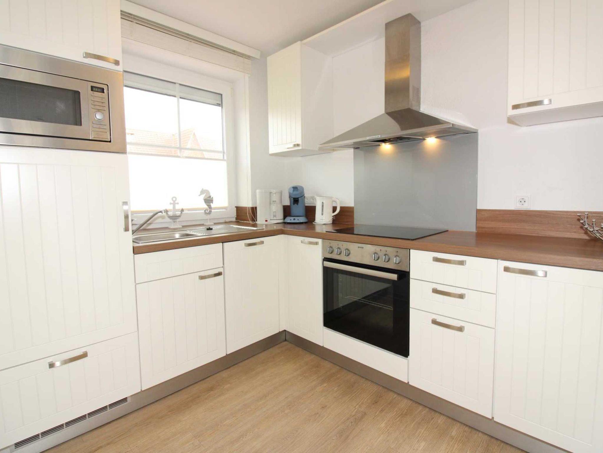 Im Erdgeschoss befinden sich ein Flur mit Garderobe, ein Dusch-Bad mit WC und Waschtrockner, ein kombinierter Wohn-/Essraum mit einem komplett ausgestatteten Küchenbereich sowie ein Abstellraum. Die Küche ist vollständig mit Kühlschrank inkl. Gefrierfach, Geschirrspüler, Backofen, Mikrowelle, Kaffeemaschine, Toaster und vielem mehr ausgestattet.