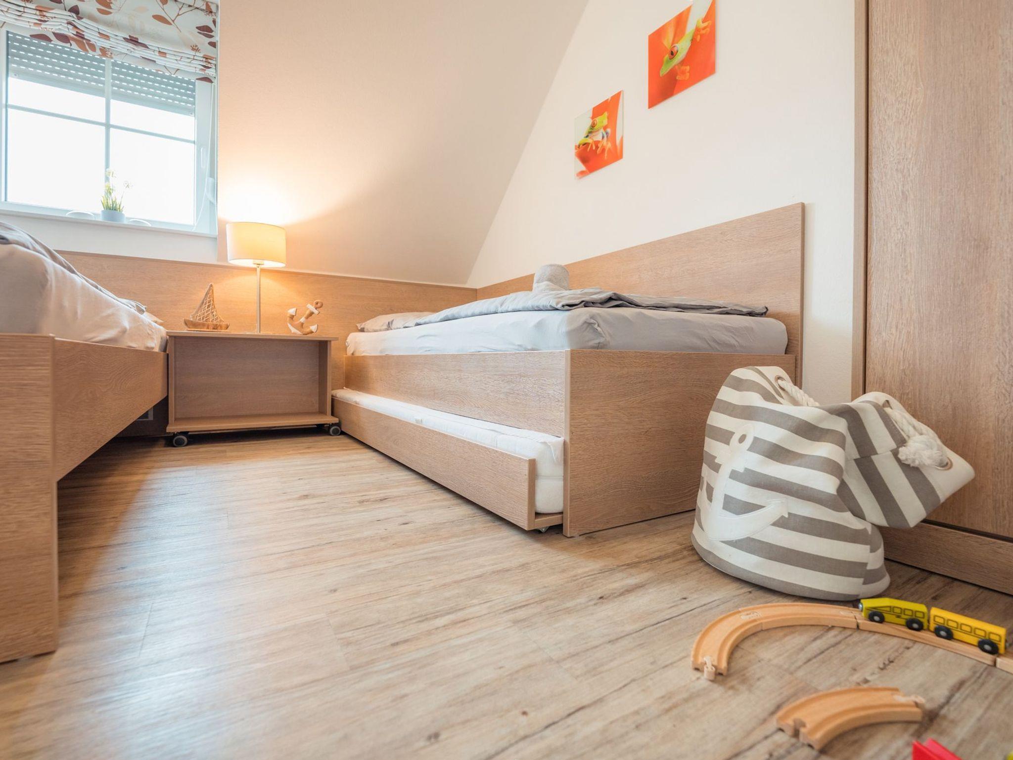 Ein Schlafraum mit zwei Einzelbetten und einem Ausziehbett am Boden
