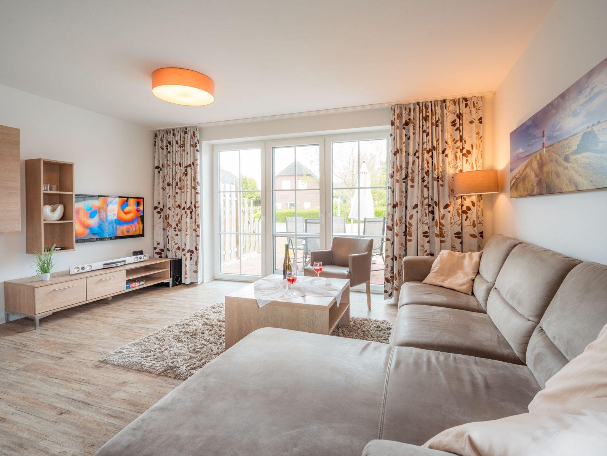 Wohnbereichmit moderner Couchgarnitur mit Ottomane, 42“3D-HD-TV mit DolbyDigital Soundbar, 3D-Blu-ray, DVD, CD, Radio, iPhone & iPod Dock, 3D-Brillen