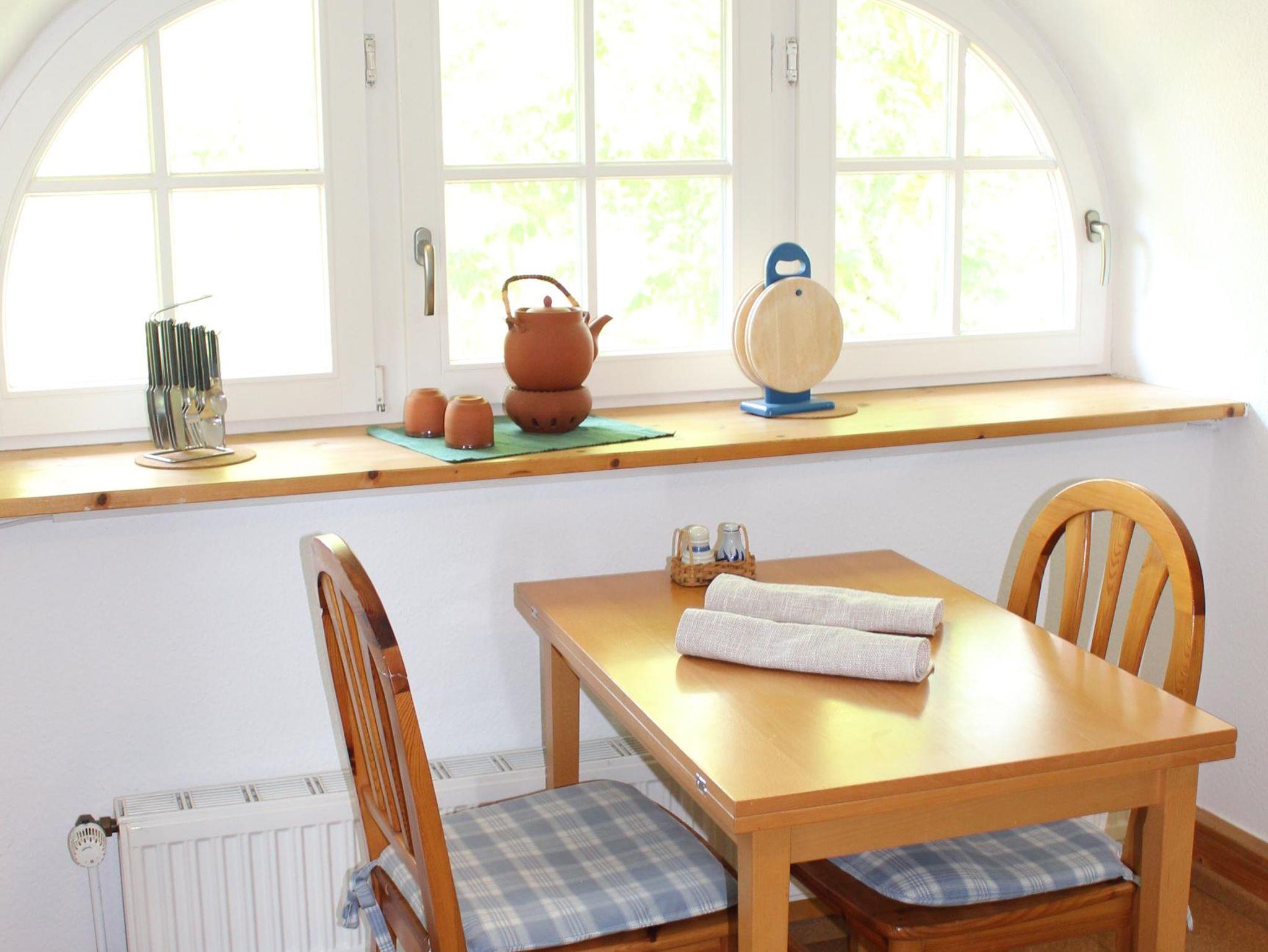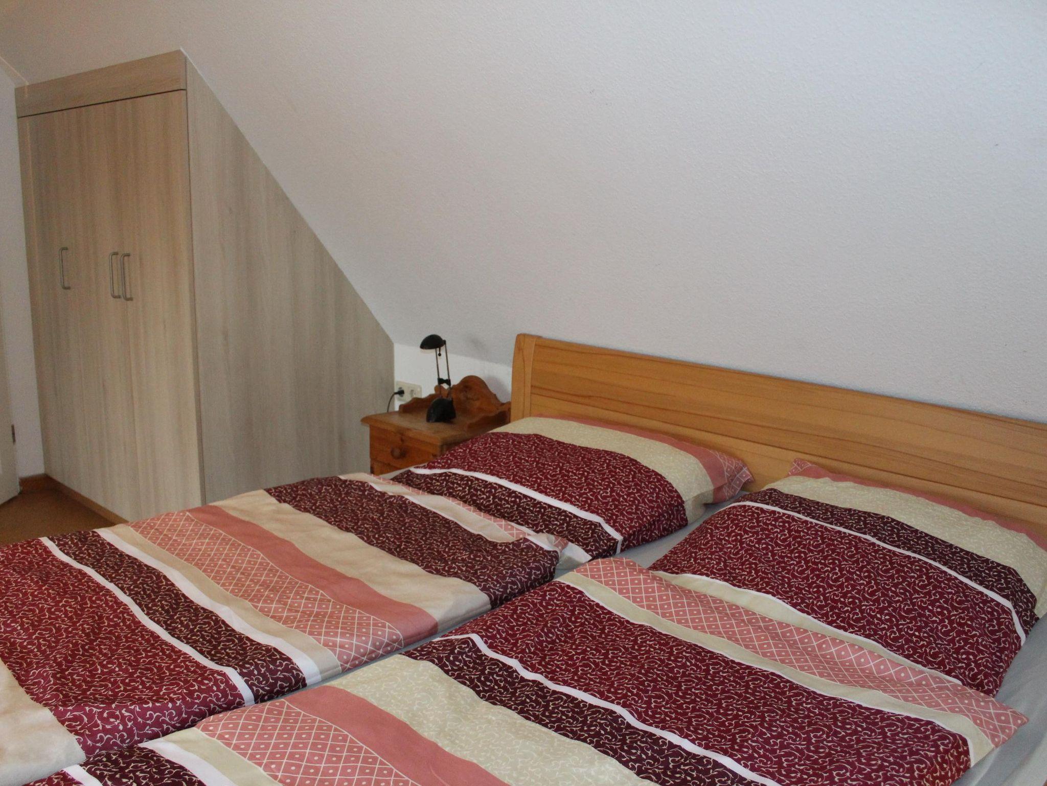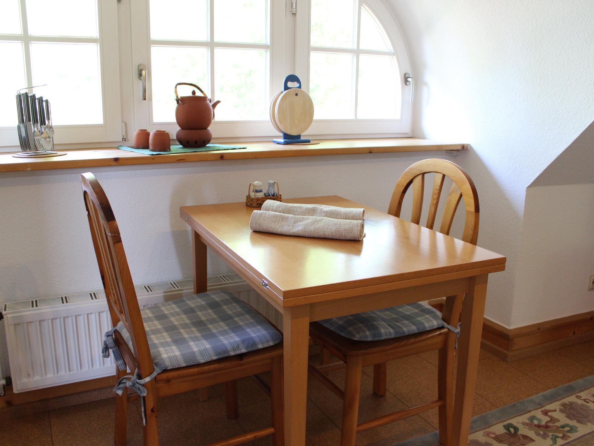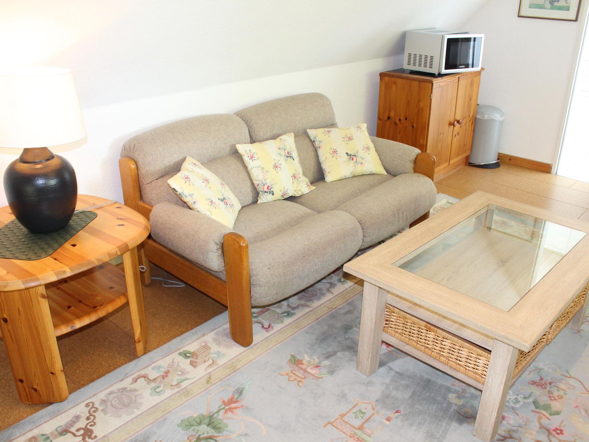 Die 50m² große Nichraucherwohnung befindet sich in der 1. Etage und bietet Platz für max. 2 Personen. Sie verfügt über ein Wohn-/Esszimmer mit Sat-TV, Radio, Sofa, Sessel sowie Esstisch mit 2 Stühlen. Die kleine Küche ist mit Ceranfeld, Backofen, Mikrowelle, Kühlschrank, Wasserkocher, Toaster, Eierkocher und Toaster ausgestattet. Die Wohnung verfügt über ein Schlafzimmer mit einem Doppelbett, Einbauschrank und Relaxecke. Das Bad ist mit WC, Dusche Waschbecken und Fön ausgestattet.