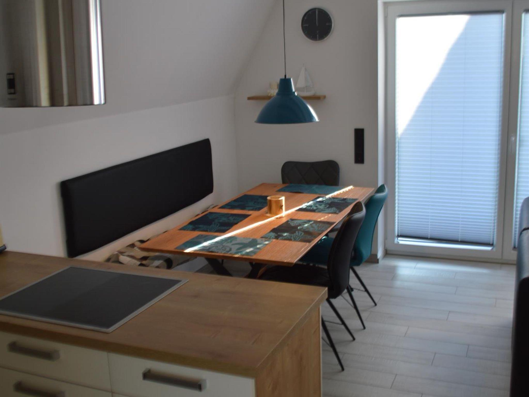 Das Erdgeschoss ist komplett gefliest, im Dachgeschoss liegt hochwertiger Laminat. Die Ausstattung ist auf dem modernsten Stand, unter anderem verfügen alle Räume über eine einzeln regelbare Fußbodenheizung. Der Wohnbereich im Erdgeschoss ist großzügig angelegt mit schönem Esstisch aus Zerreiche mit passender Bank und 4 bequemen Stühlen. Die Sofaecke bietet genügend Platz für die Familie und einen tollen Blick auf den 49-LED-Fernseher. Die NOLTE-Küche ist für den täglichen Bedarf bestens ausgestattet. Das große Bad verfügt über ein Außenfenster, großen Waschtisch, ebenerdiger Dusche mit Tellerkopf- und Handbrause, WC und einem Waschtrockner. Ins Dachgeschoss kommen Sie über eine Wohnraumtreppe, dort befindet sich ein Schlafraum mit einem Doppelbett (160x200), sowie ein weiteres Schlafzimmer mit einem Ausziehbett (bis 160x200) und einem Fernseher. An beiden Fenstern der Schlafzimmer sind im Sommer Insektenschutzgitter angebracht. Kostenloses W-LAN steht Ihnen zur Verfügung.