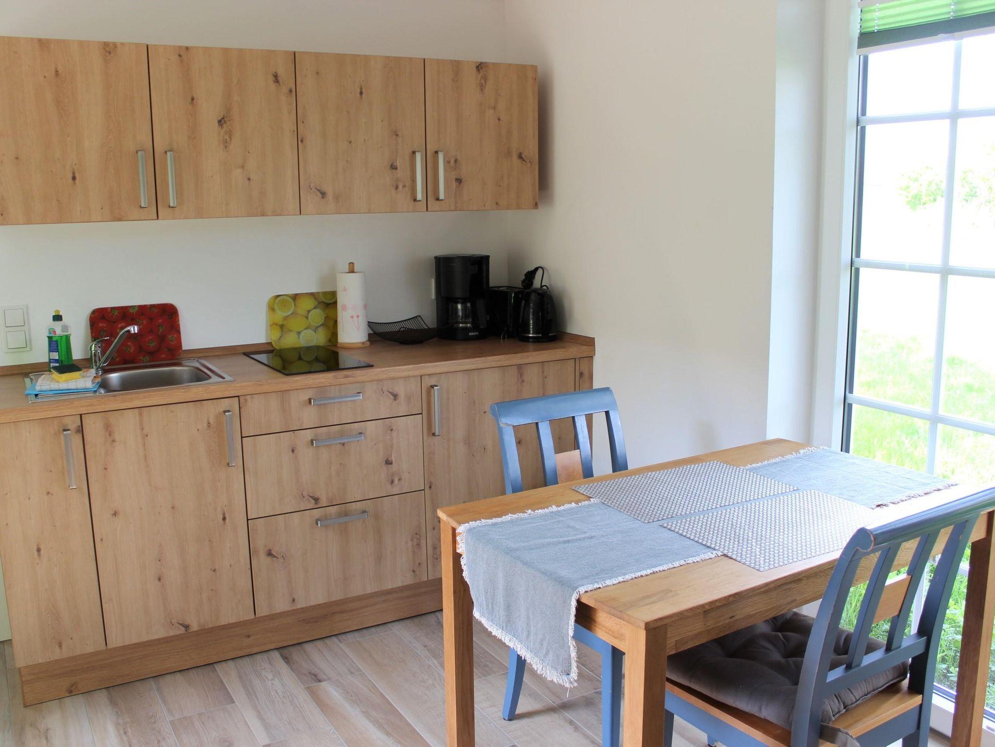 Die 50m² große Nichraucherwohnung befindet sich im Erdgeschoss und bietet Platz für max. 2 Personen. Sie verfügt über ein Wohn-/Esszimmer mit Sat-TV, Radio, 2 Fernsehsessel sowie Esstisch mit 2 Stühlen. Die kleine Küche ist mit Ceranfeld, Backofen, Mikrowelle, Kühlschrank, Wasserkocher, Toaster, Eierkocher und Toaster ausgestattet. Die Wohnung verfügt über ein Schlafzimmer mit einem Doppelbett, Kommode und Relaxecke. Das Bad ist mit WC, Dusche, Waschbecken und Fön ausgestattet.