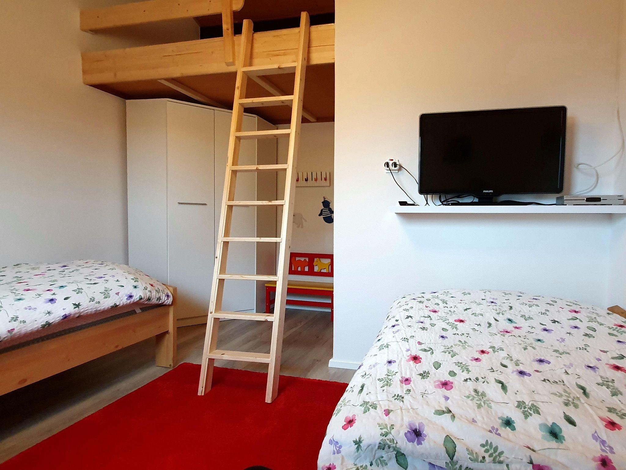 Hochbett mit 120x200 Matratze im Kinderzimmer als 5.Bett, gemütlich und mit Lampe und Steckdose versehen.