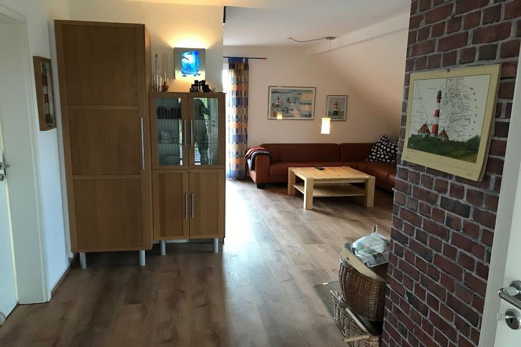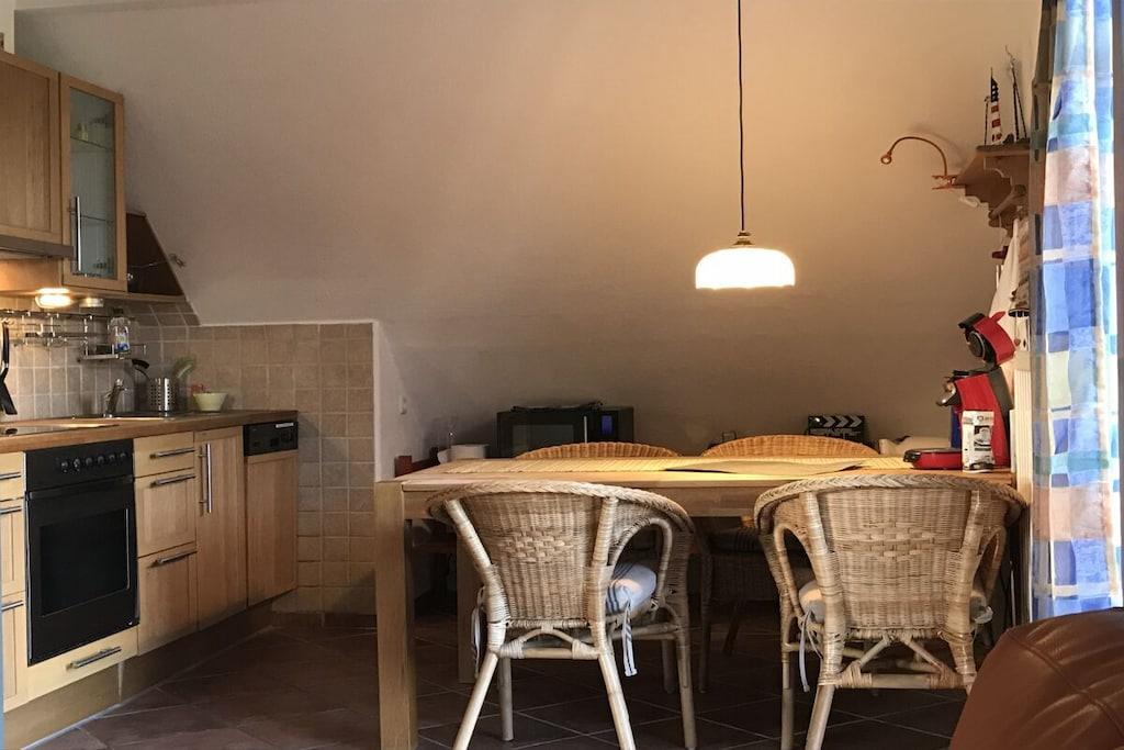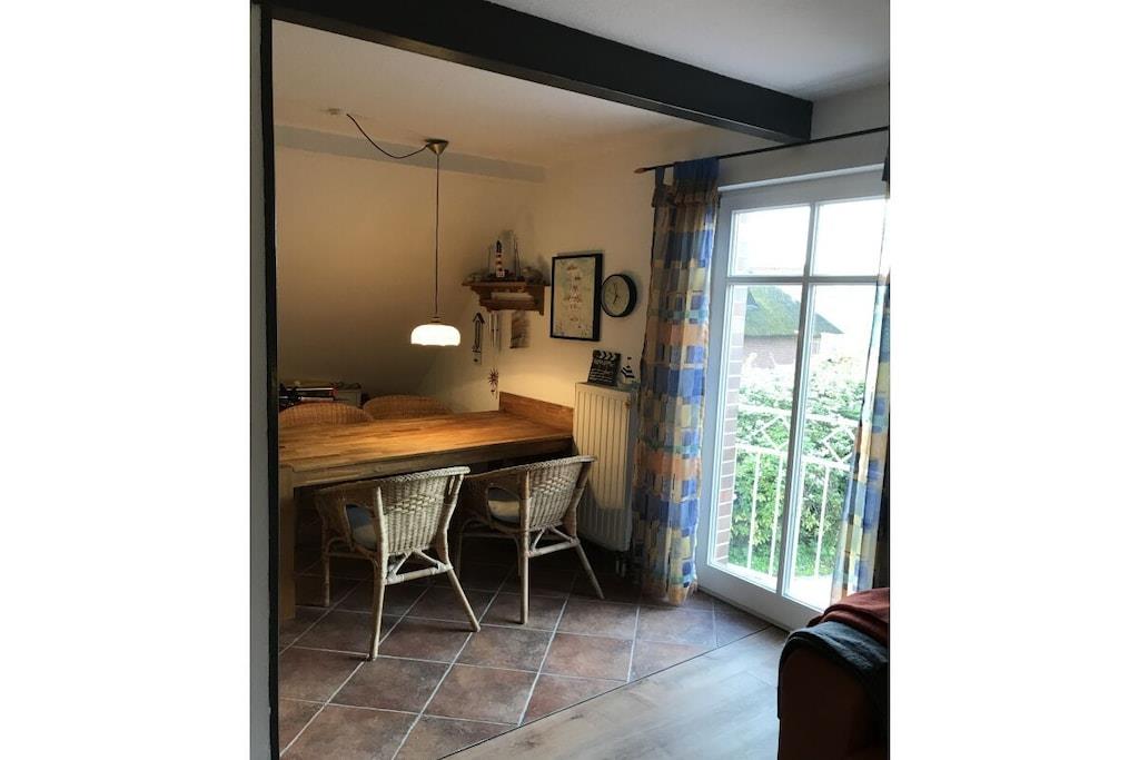 Butje wurde mit viel Herz von einem Arbeitshaus zu einem gemütlichen Ferienhaus umgebaut und liegt im Obergeschoss, erreichbar über einen separaten Eingang. Mit viel Liebe zum Detail wohnen Sie hier auf 65 m2 im teiloffenen Wohn- und Küchenbereich, 2 Schlafzimmer bieten Platz für 4 Personen. Im Bad mit Dusche kann auch die Waschmaschine genutzt werden. Durch die Fußbodenheizung in Küche und Bad gibt es nie kalten Füße . Im Wohnbereich sorgt in der kälteren Jahreszeit ein Ofen für wohlige Wärme und eine schöne Atmosphäre. Ein großer Balkon ( Süd West Ausrichtung ) mit Markise und Strandkorb lädt zum entspannen ein. Ein Gasgrill kann kostenlos gestellt werden. Sie haben einen Parkplatz in unserem Carport und es ist eine Wallbox vorhanden .