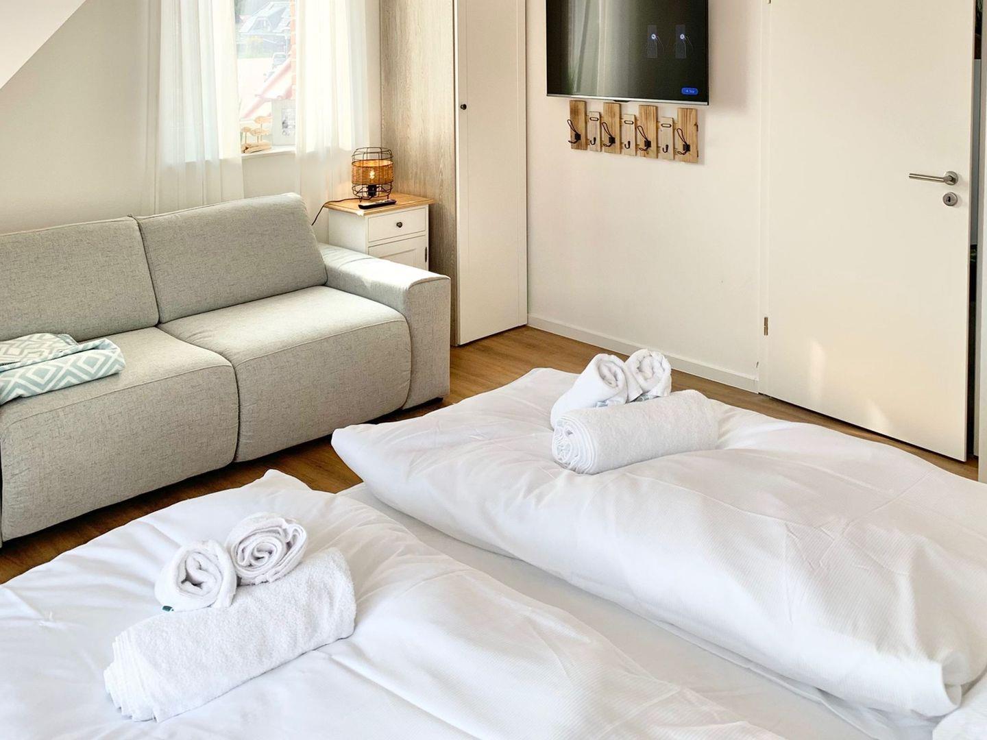 Schlafen 1: Doppelbett (Boxspring) + Schlafsofa
