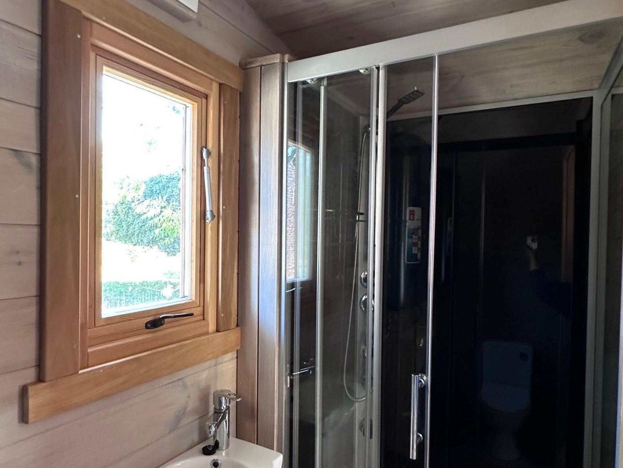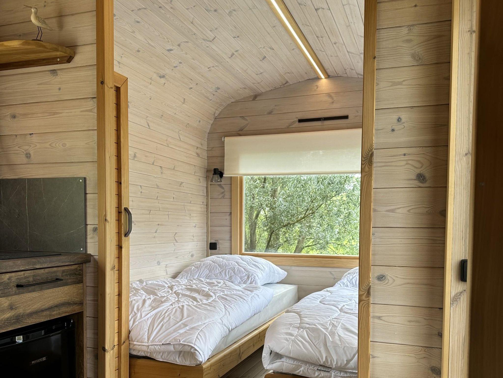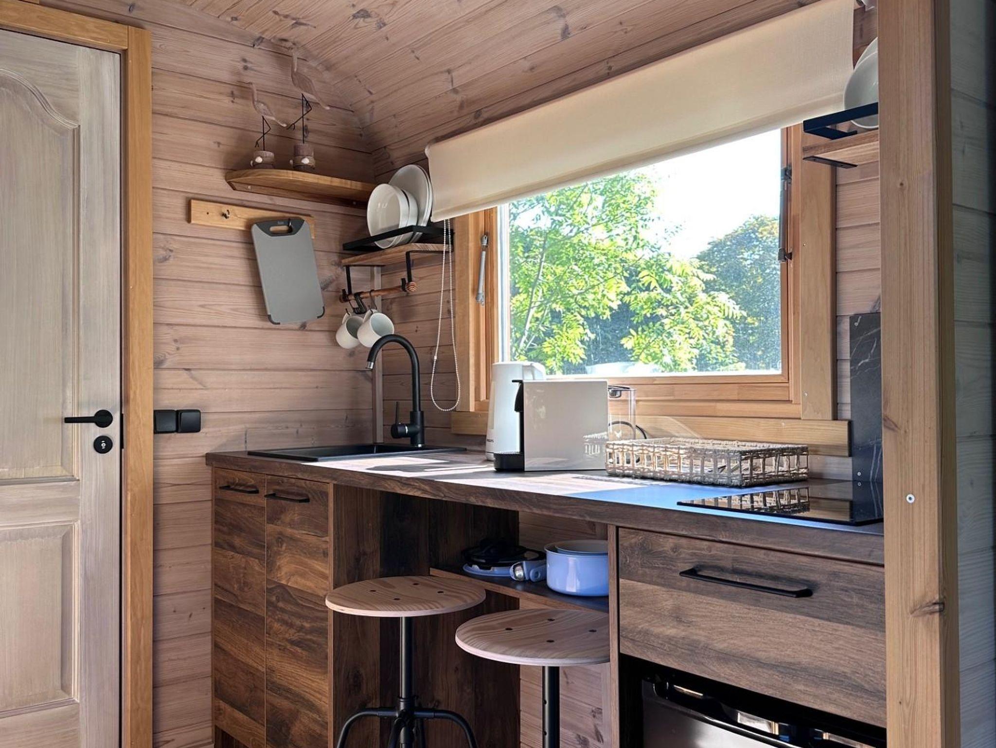 Das Tiny-Haus in Bauform eines Schlaffasses für zwei Personen bietet eine komfortable Grundausstattung in schönem Holzdesign mit zwei Einzelbetten (90x200cm), großem Panorama-Fenstern, kleiner Pantry-Küche mit Essbereich und Bad mit Dusche und WC. Eine Sitzmöglichkeit mit Tisch und Stühlen befindet sich vor dem Schlaffass auf einer Terrasse.