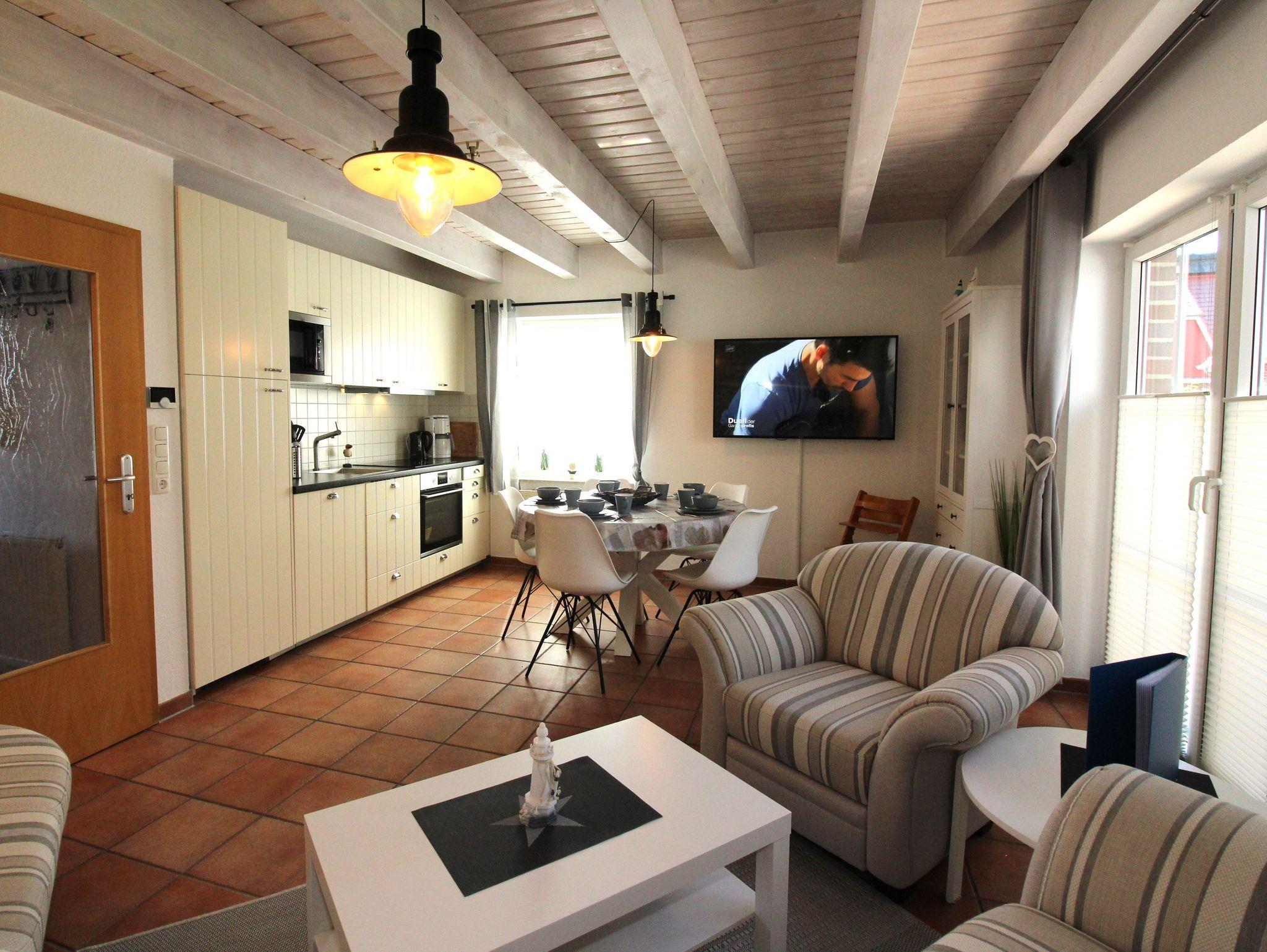 Die Küche ist voll ausgestattet. In die Küchenzeile sind ein Kühlschrank mit integriertem Gefrierfach, ein Geschirrspüler, ein Kochfeld mit vier Ceranfeldern / Backofen und ein Mikrowellengrill eingebaut. Geschirr und Besteck sind für je 12 Personen vorhanden. Desweiteren gibt es Kindergeschirr und -besteck für die Kleinen.