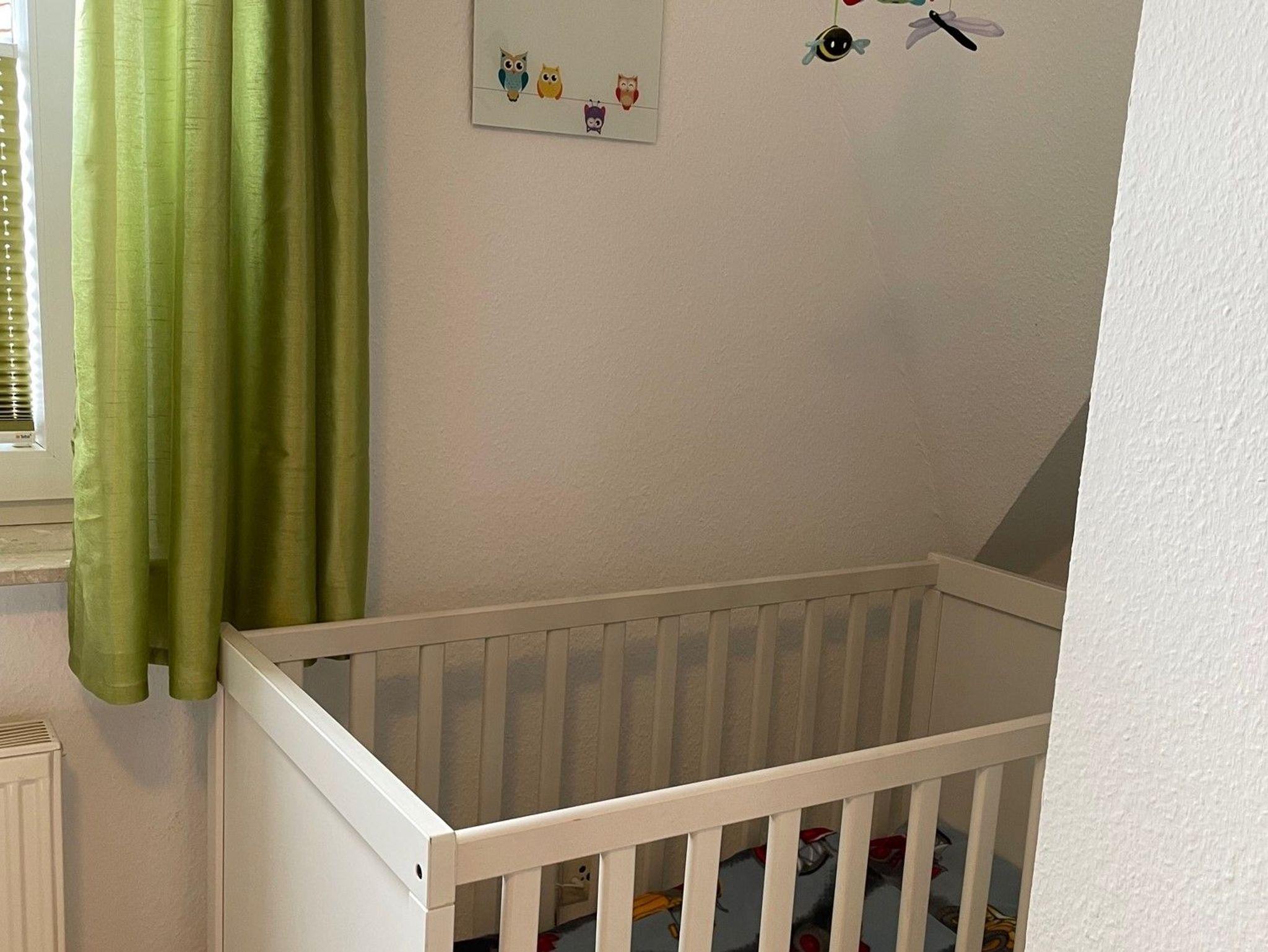 Das 1. Schlafzimmer ist mit einem Doppelbett (180 cm x 200 cm) und einem festen Kindergitterbett (60 cm x 120 cm) ausgestattet.