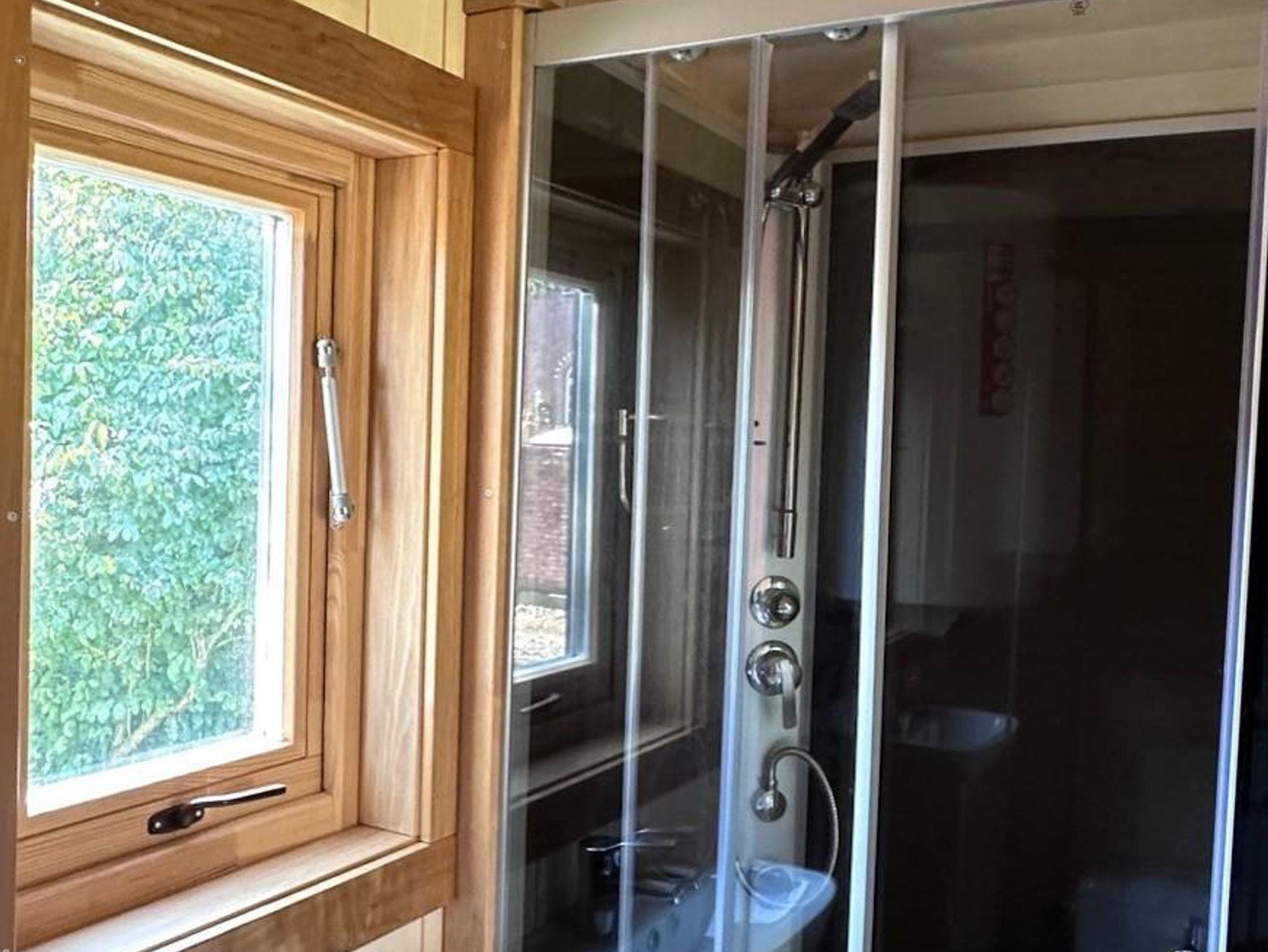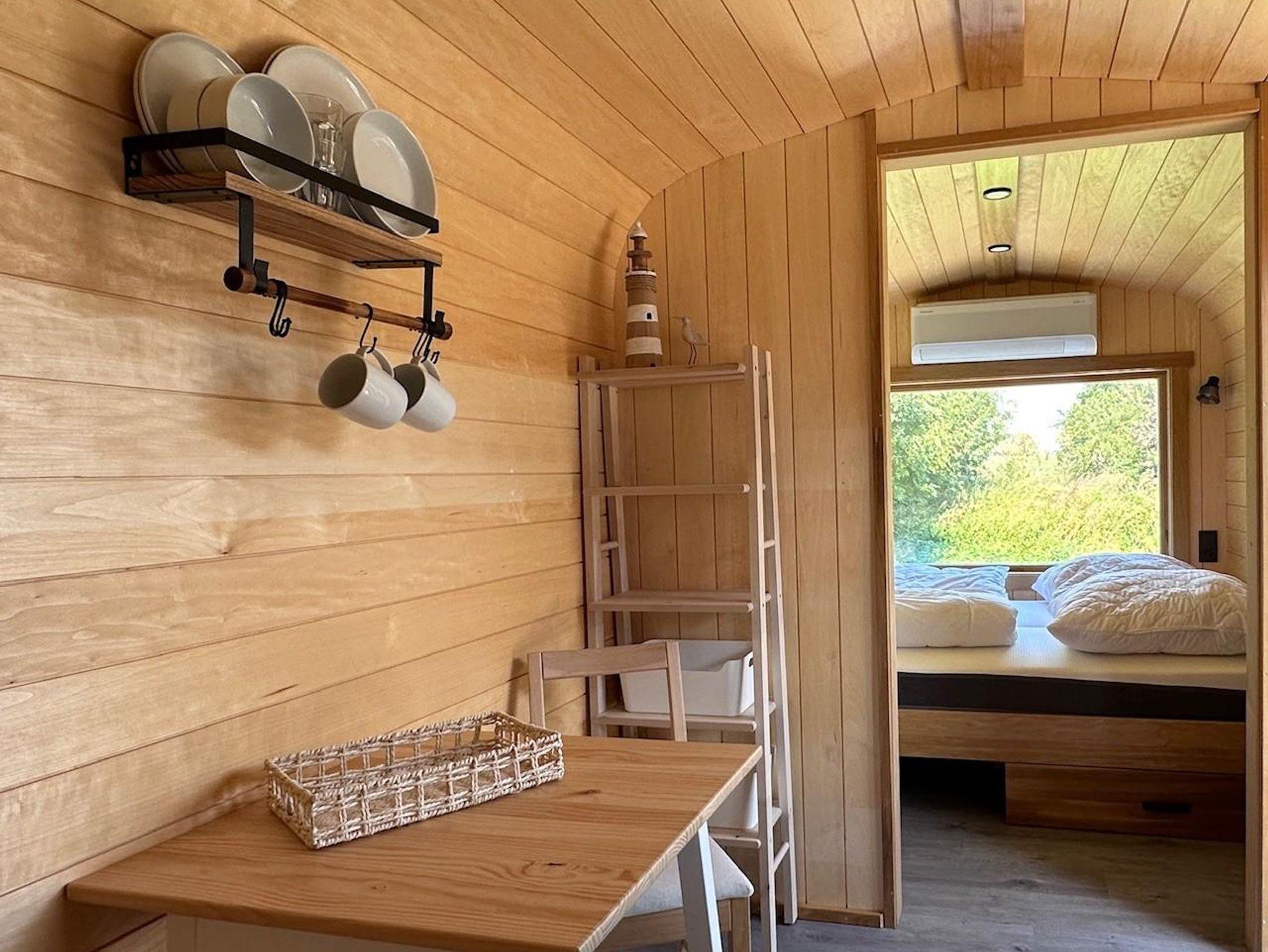 Das Tiny-Haus in Bauform eines Schlaffasses für zwei Personen bietet eine komfortable Grundausstattung in schönem Holzdesign mit einem Doppelbett (160x200cm), großem Panorama-Fenstern, kleiner Pantry-Küche mit Essbereich und Bad mit Dusche und WC. Eine Sitzmöglichkeit mit Tisch und Stühlen befindet sich vor dem Schlaffass auf einer Terrasse.