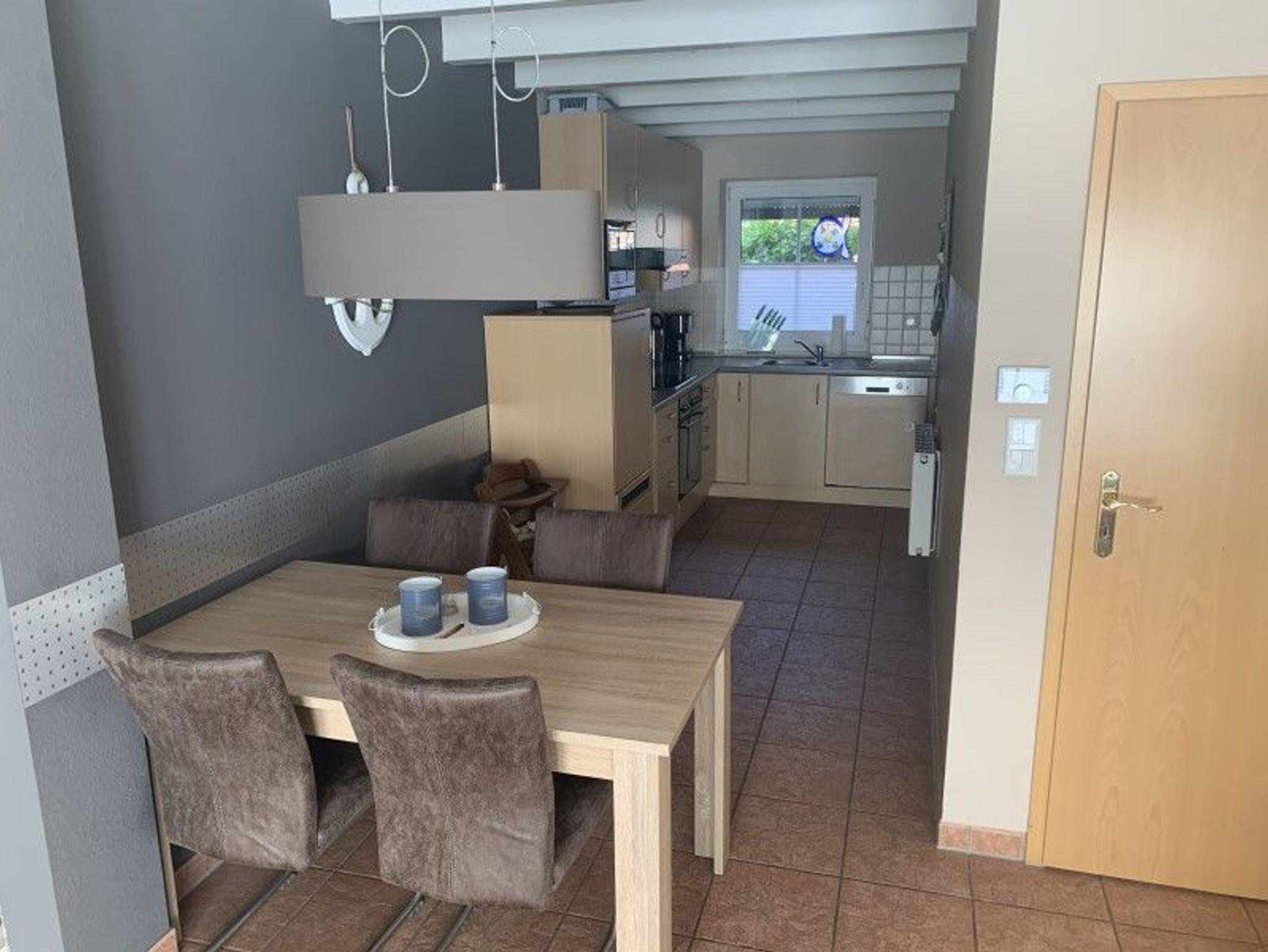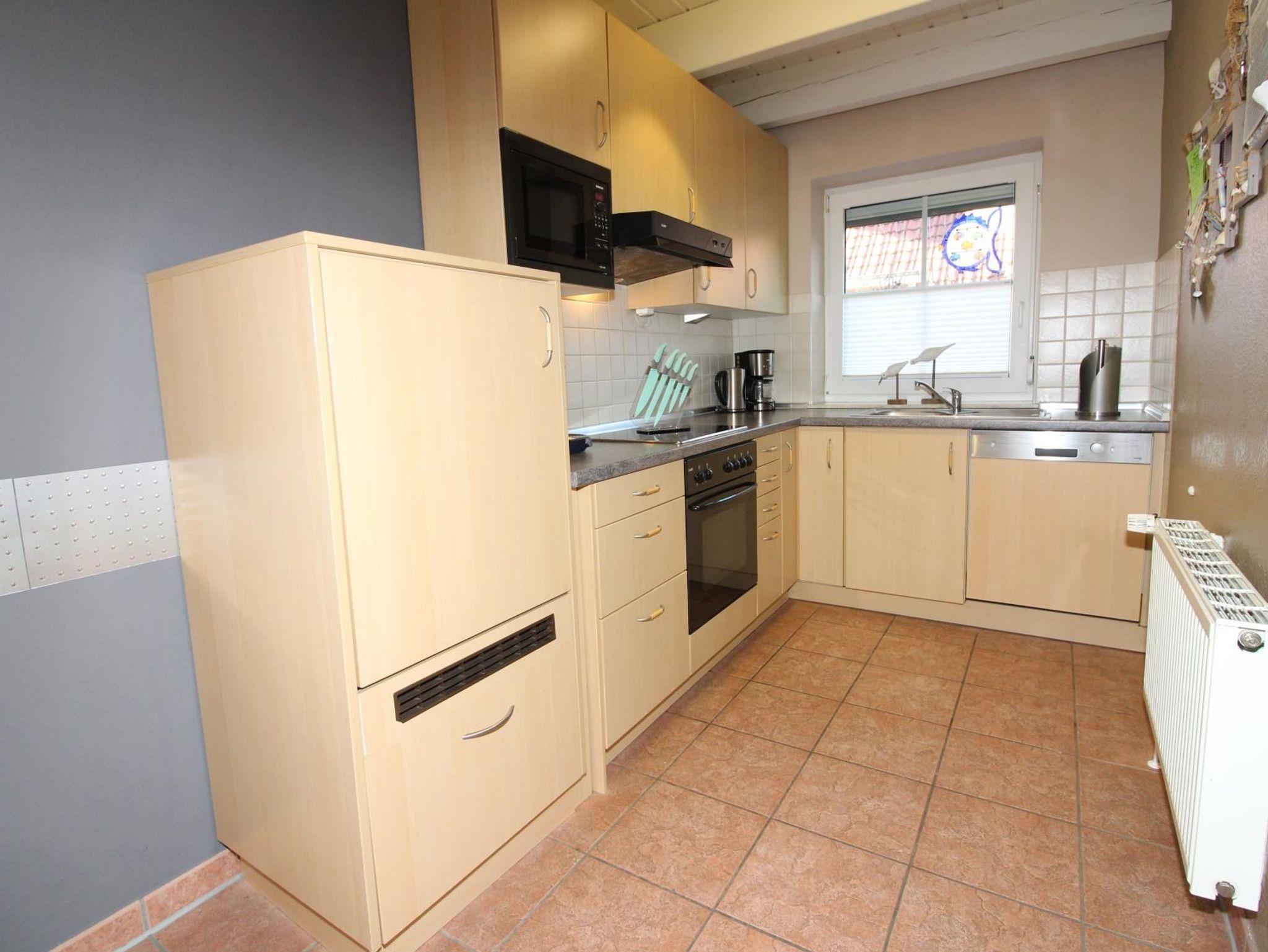 Dieoffene Küche ist ausgestattet mit Backofen, Spülmaschine, Mikrowelle, Kaffeemaschine, Wasserkocher und Toaster. Geschirr und Gläser sind ausreichend vorhanden. Der Essbereich lädt mit großem Tisch und gemütlichen Stühlen bis zu 6 Personen ein.