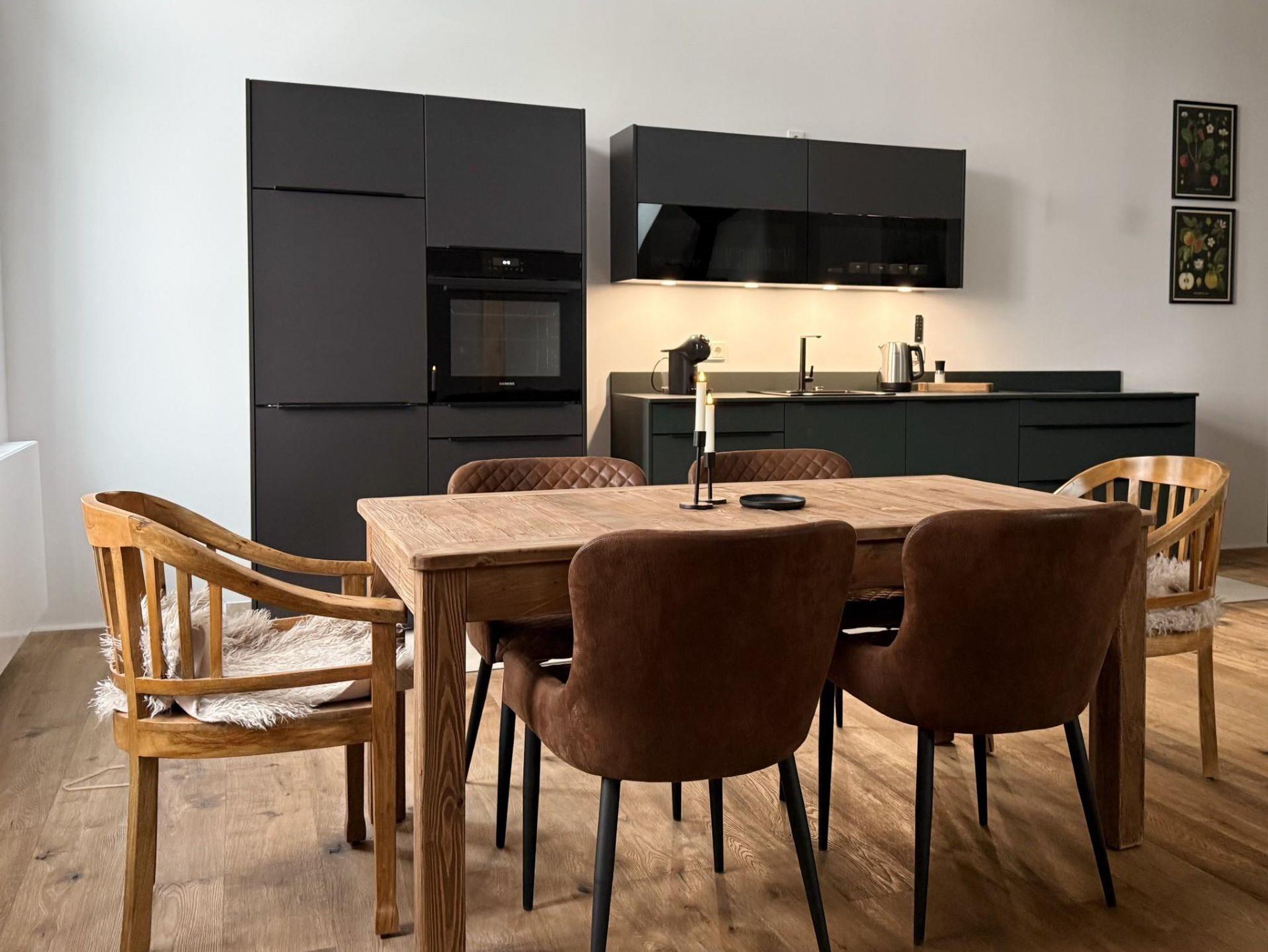 Die 3-Zimmer-Ferienwohnung für bis zu fünf Personen hat einen offenen Wohnraum mit vollständig eingerichteter hochwertiger Küche und zwei Schlafzimmer. Im Wohnraum finden Sie zwei gemütliche Sofas sowie einen Sessel zum Entspannen nach einem tollen Urlaubstag und einen schönen Essbereich. In den beiden Schlafzimmern befindet sich jeweils ein hochwertiges Doppelbett (180x200cm) für erholsame Nächte sowie in einem der Schlafzimmer eine zusätzliche Schlafcouch für eine Person. Ein Duschbad rundet die Ferienwohnung ab. Eine Terrasse mit Sitzmöglichkeiten befindet sich vor dem Gutshaus.