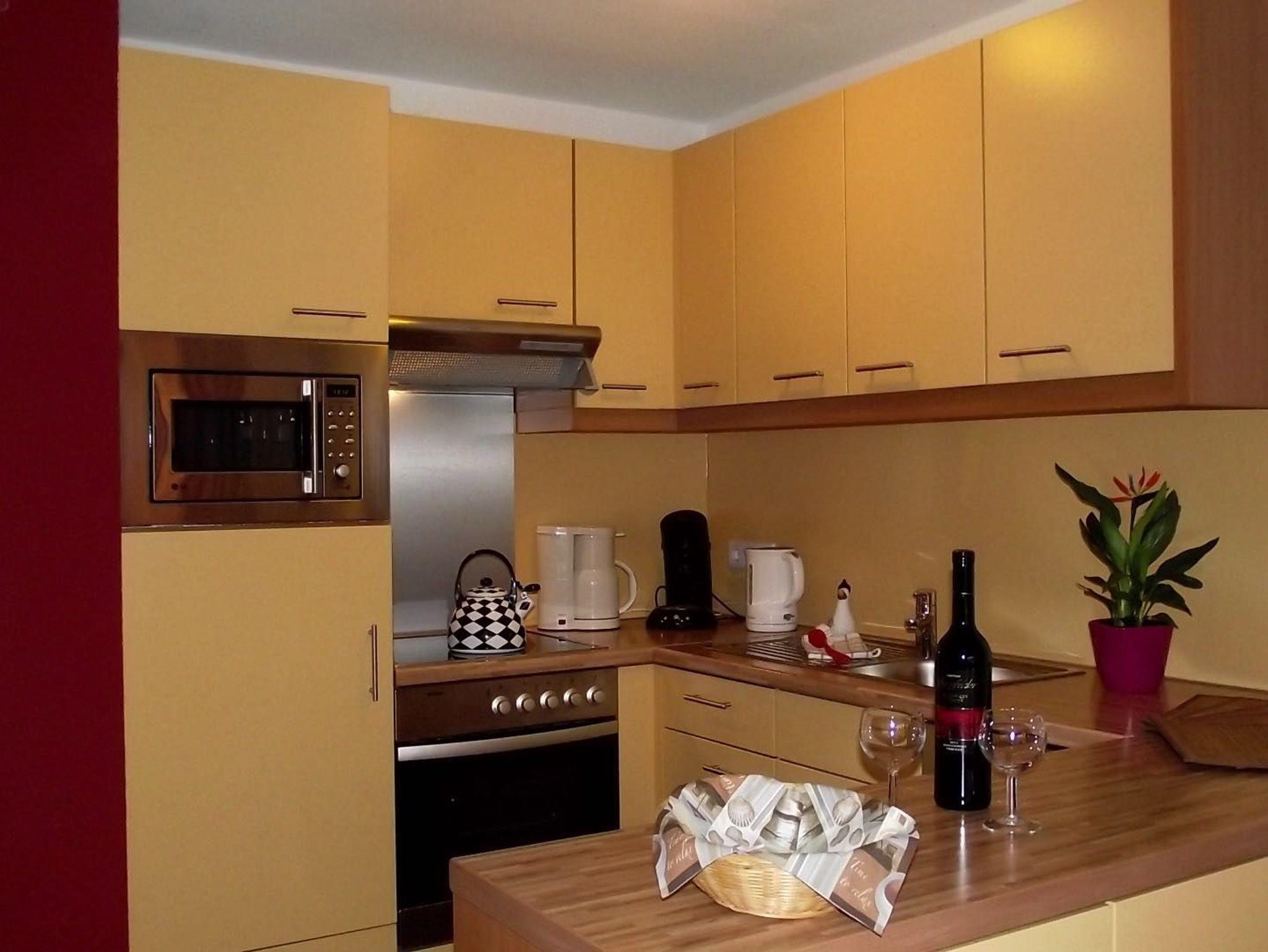 ausgestatteten Küchenbereich mit Ceran-Kochfeld, Geschirrspüler, Mikrowelle und großzügiger