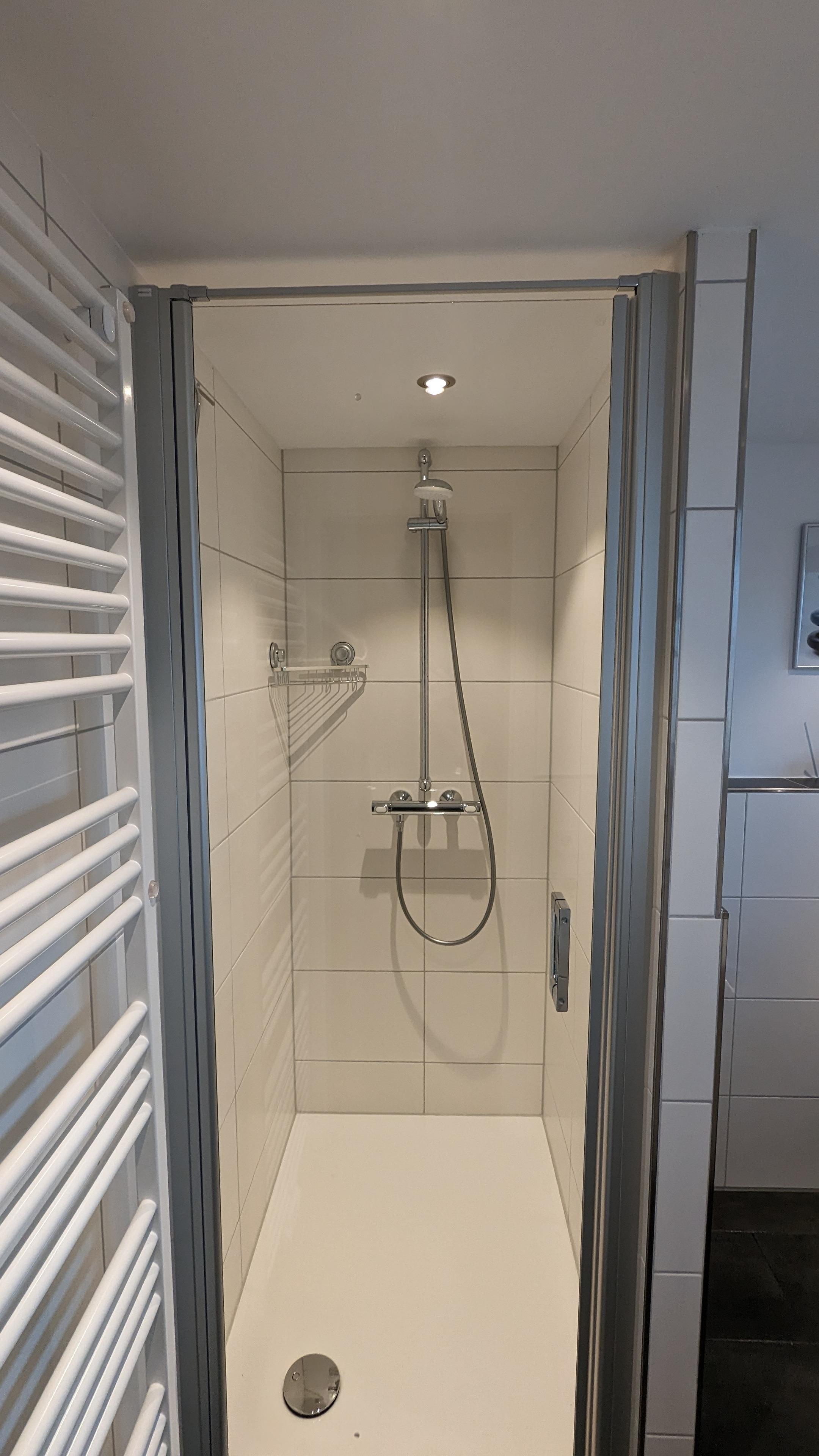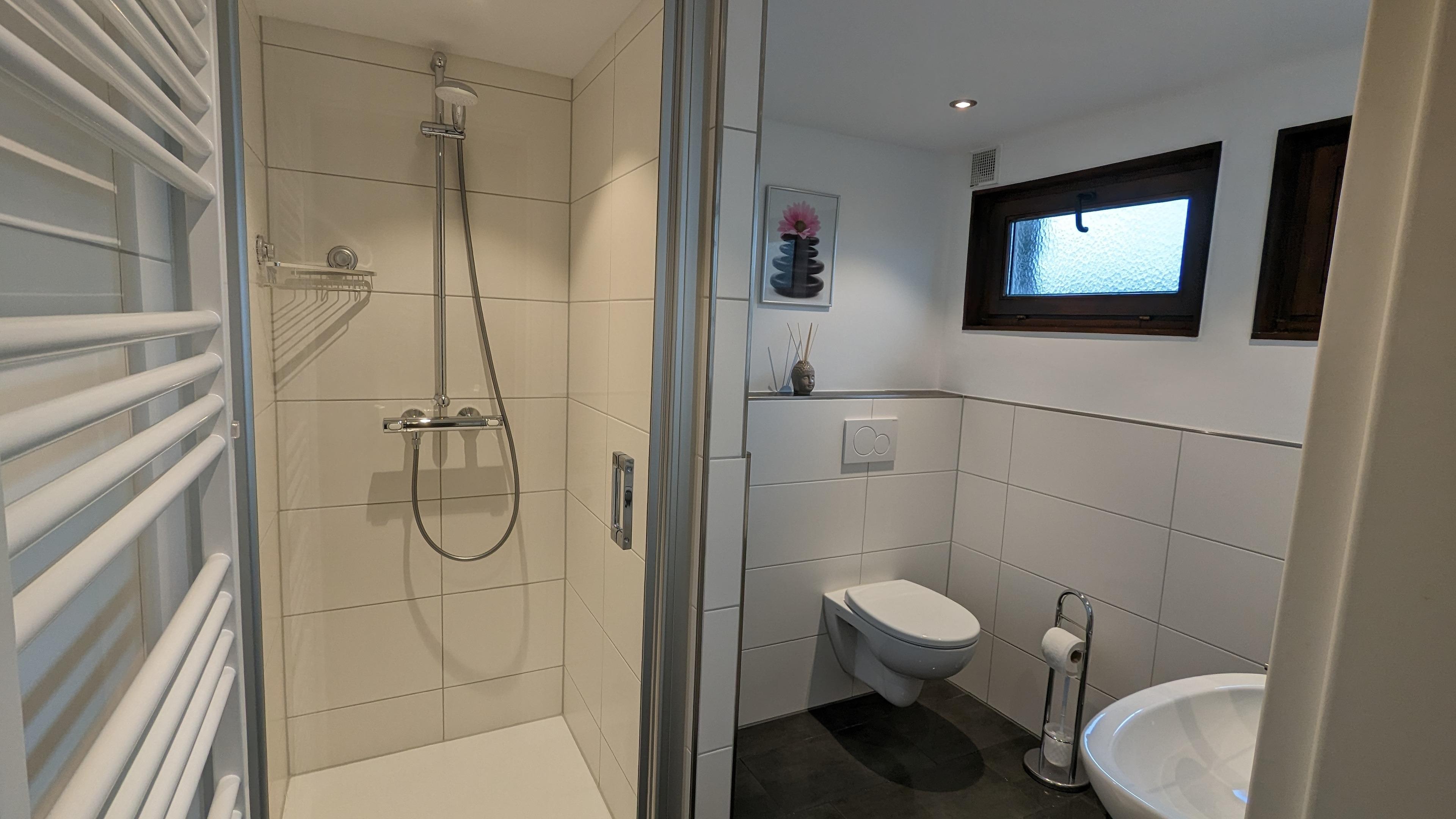 Ebenso befinden sich im Erdgeschoss das Badezimmer mit Dusche und Fön sowie eine Waschmaschine.