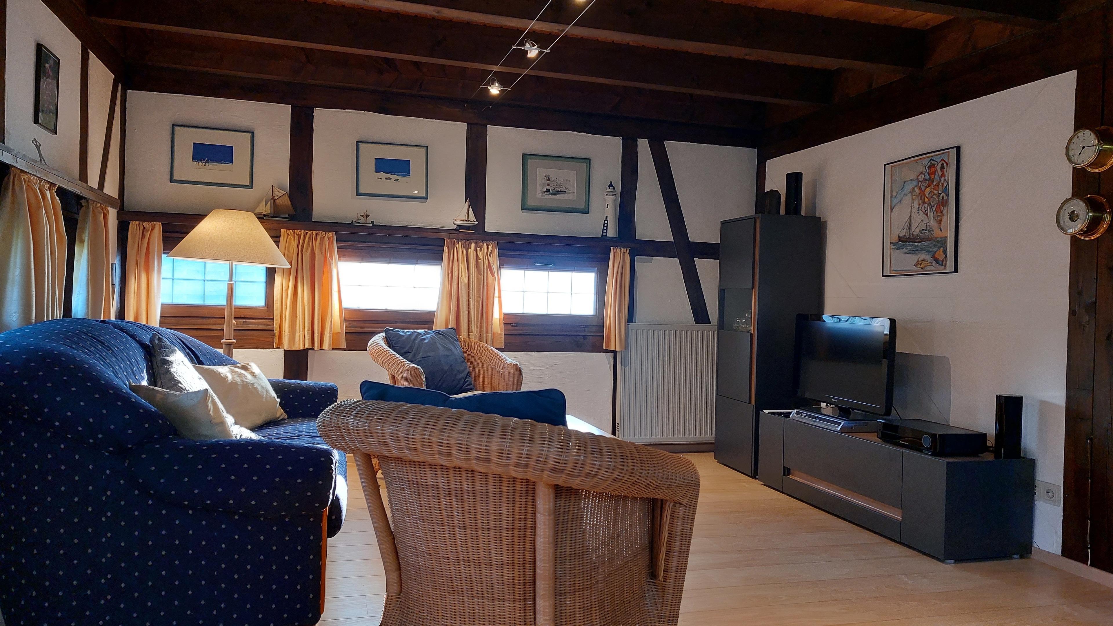 Ein paar Stufen hinab befindet sich das gemütliche Wohnzimmer mit Kamin, Flachbild-TV, DVD Player, Sofa und Sessel. Somit steht einem schönen Film- oder Spieleabend nichts im Weg.