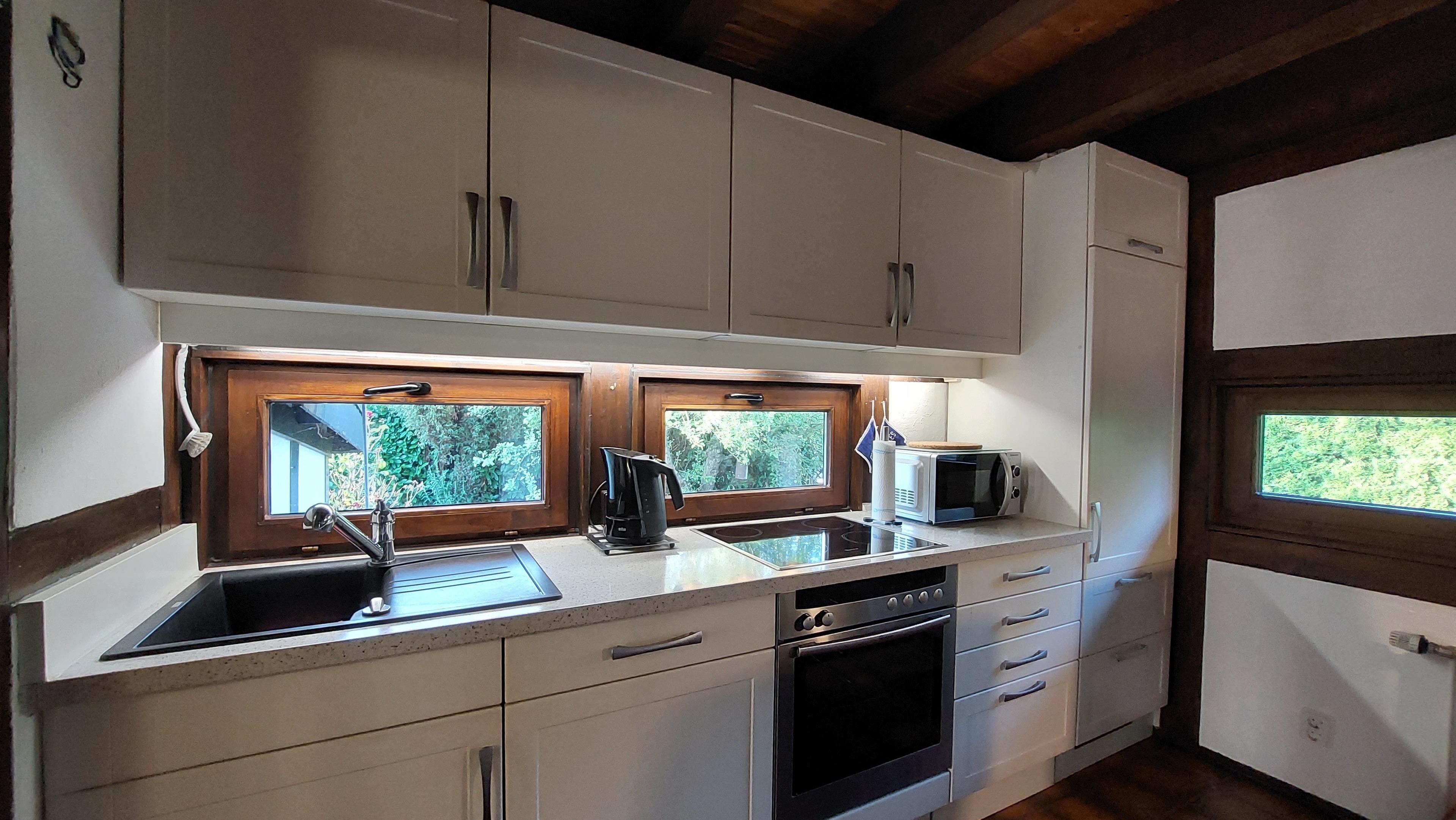 Mikrowelle, Kapselmaschine, Wasserkocher, Spülmaschine, Backofen, Toaster und ein Kühlschrank mit Gefrierfach, alles ist vorhanden.