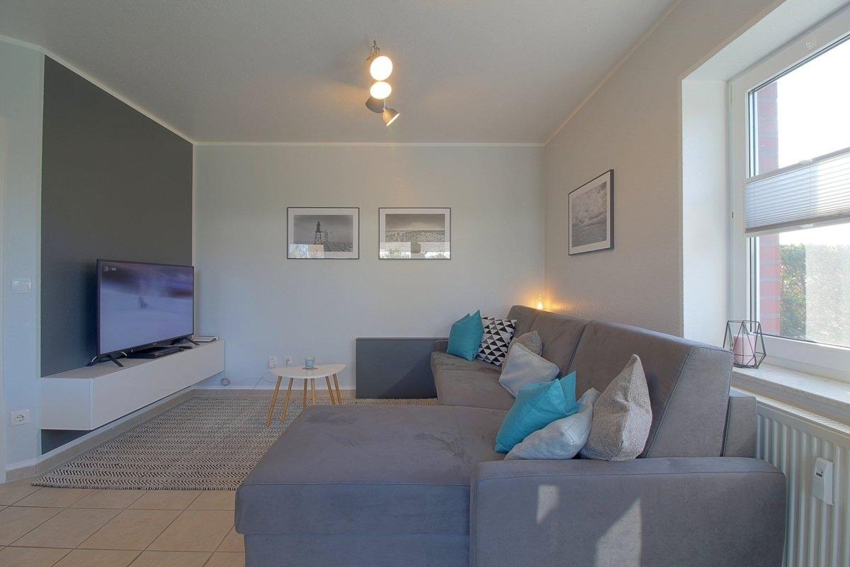 Im Wohnbereich steht ein bequemes Sofa als komfortables Schlafsofa nutzbar mit direktem Ausgang auf die überdachte Terrasse und ein großer Flat-TV zur Verfügung.
