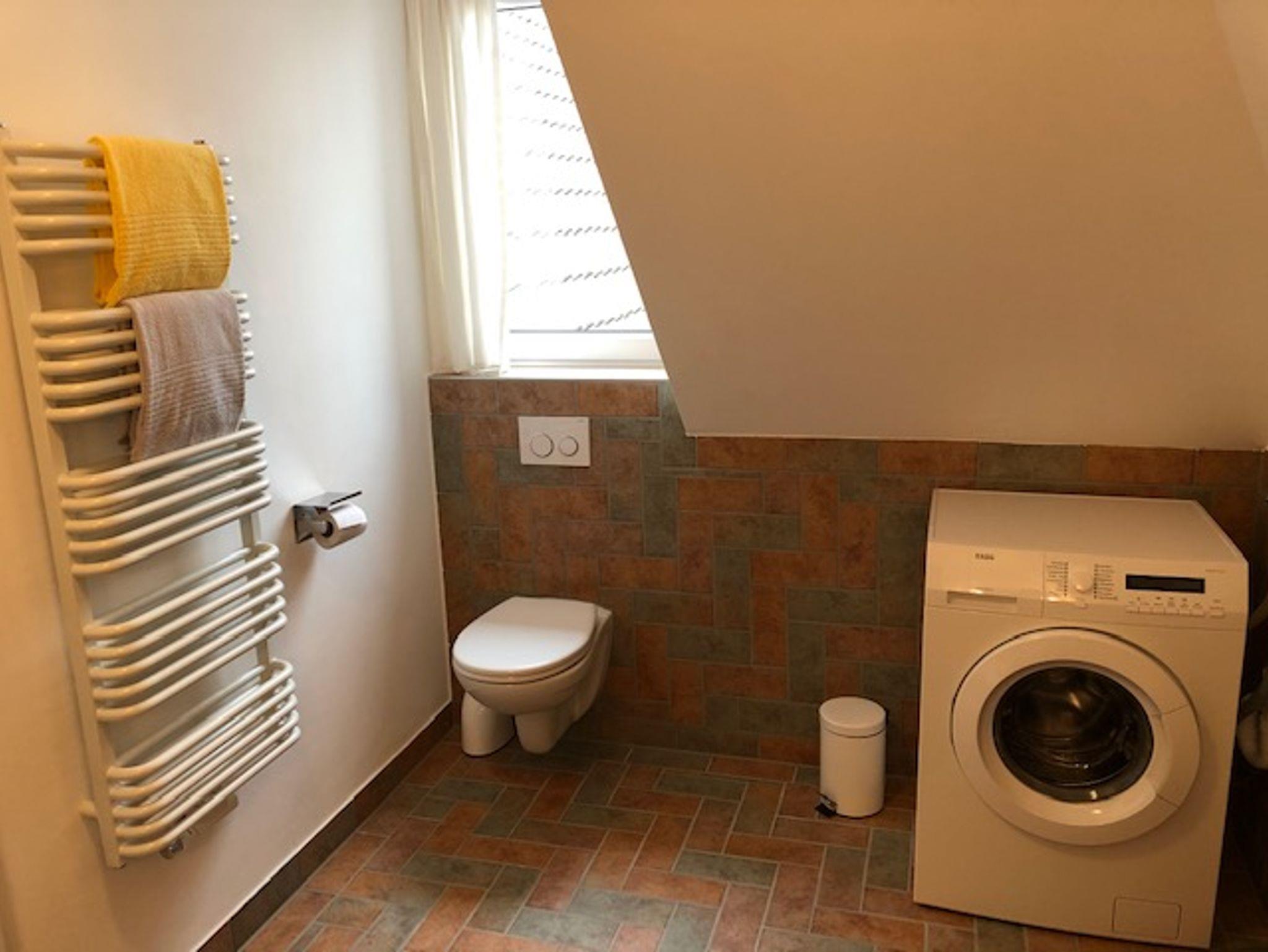 Badezimmer: große Echtglasdusche (90x90cm) mit Regendusche, Handtuchheizkörper, Waschmaschine, Haartrockner und ausreichend Handtücher und Duschvorleger.