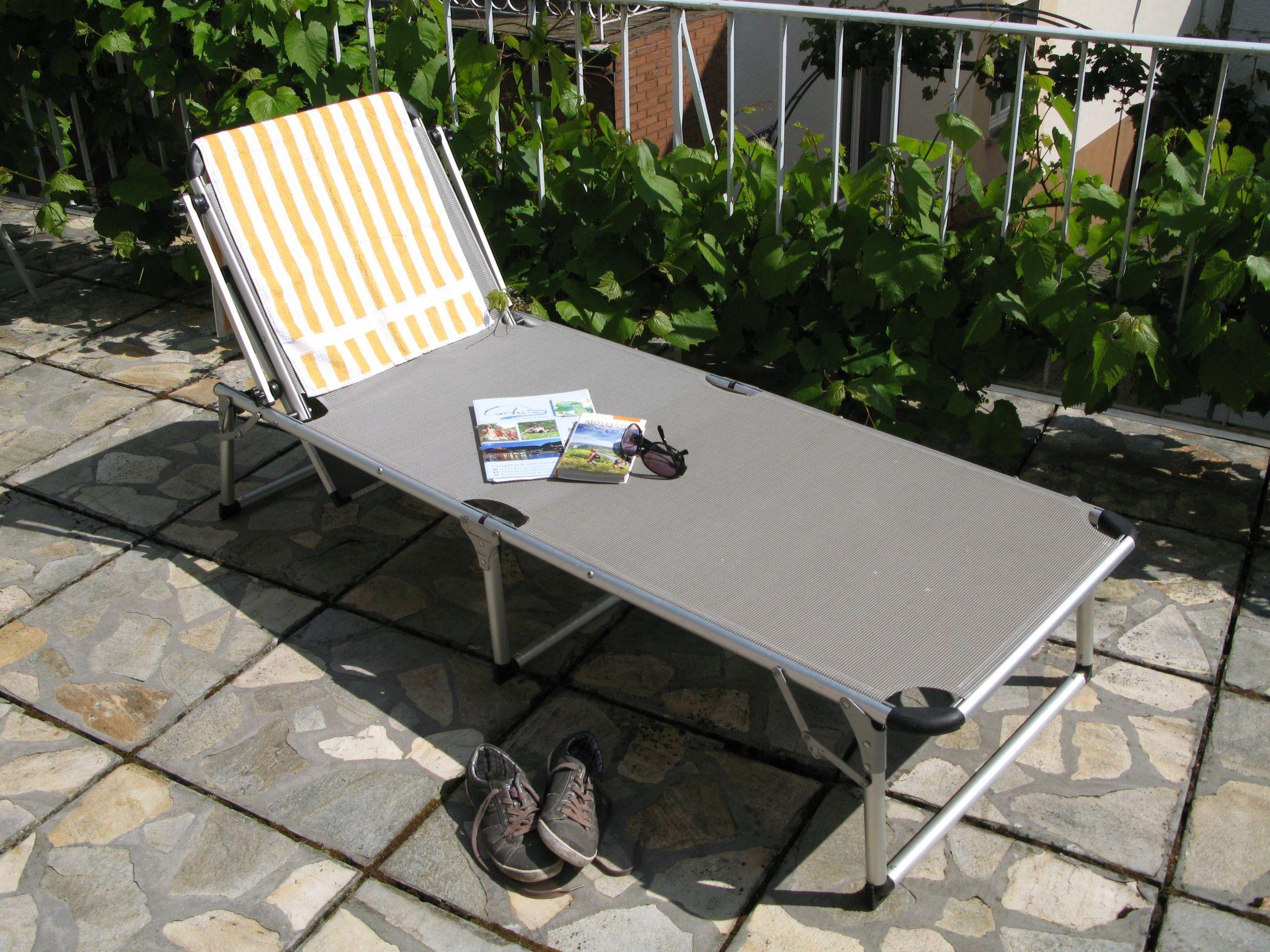 At the front is a spacious sun terrace with awning, sun loungers and deckchairs; behind the house is an idyllic little garden with a shady vine arbour for relaxing or barbecuing.