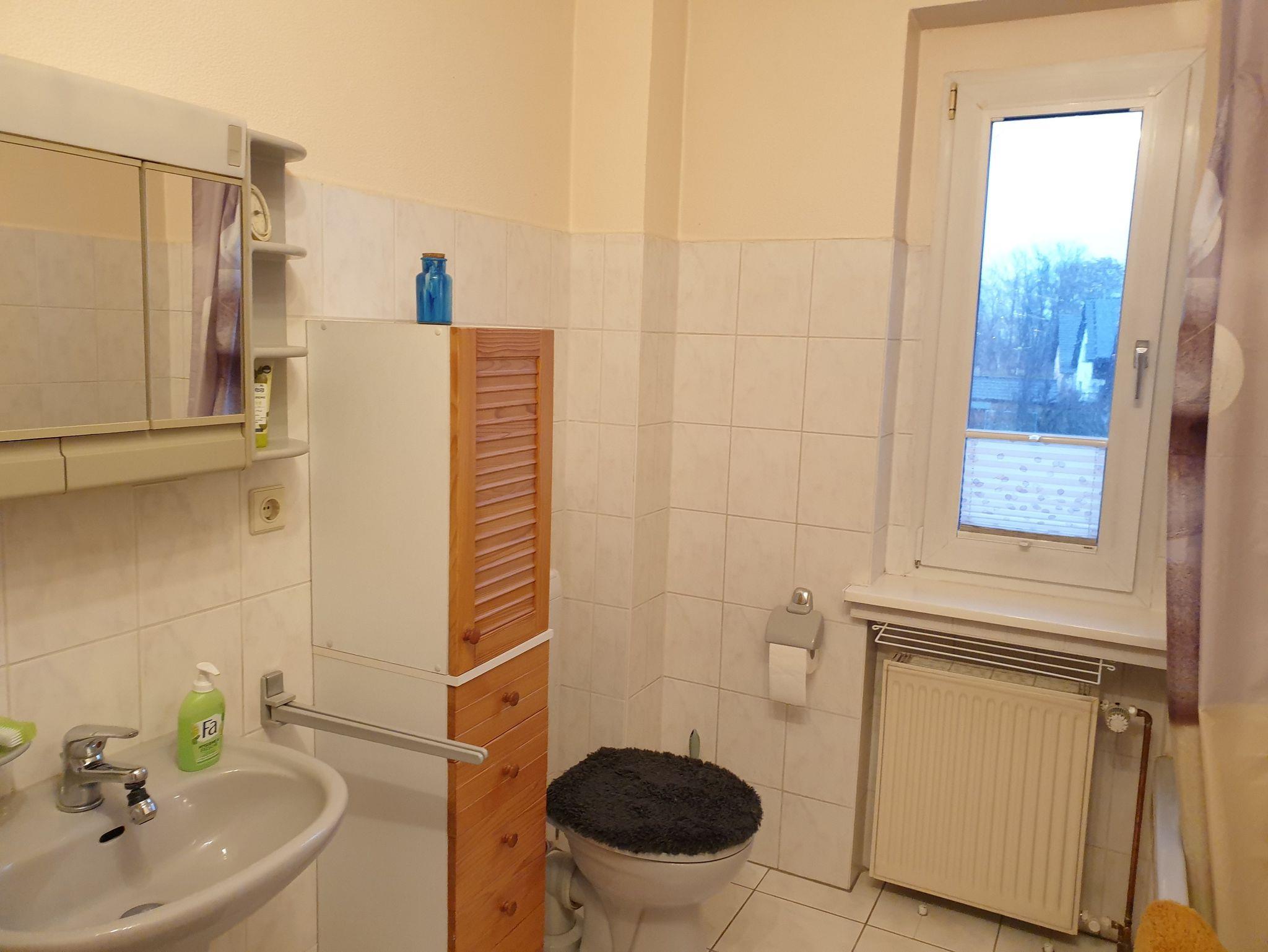 Das helle Badezimmer verfügt über eine Badewanne, ein WC sowie Handtücher, Fön und