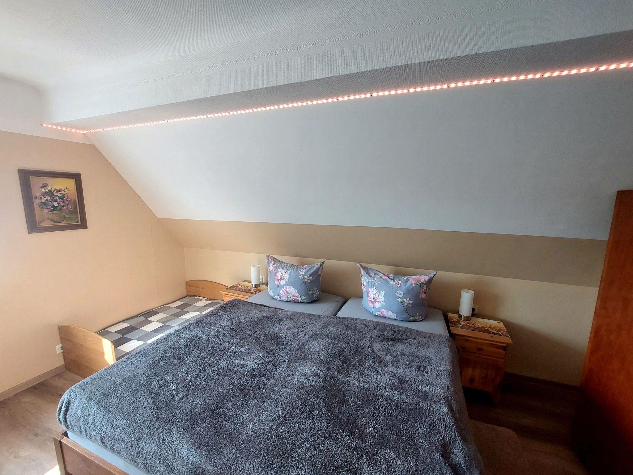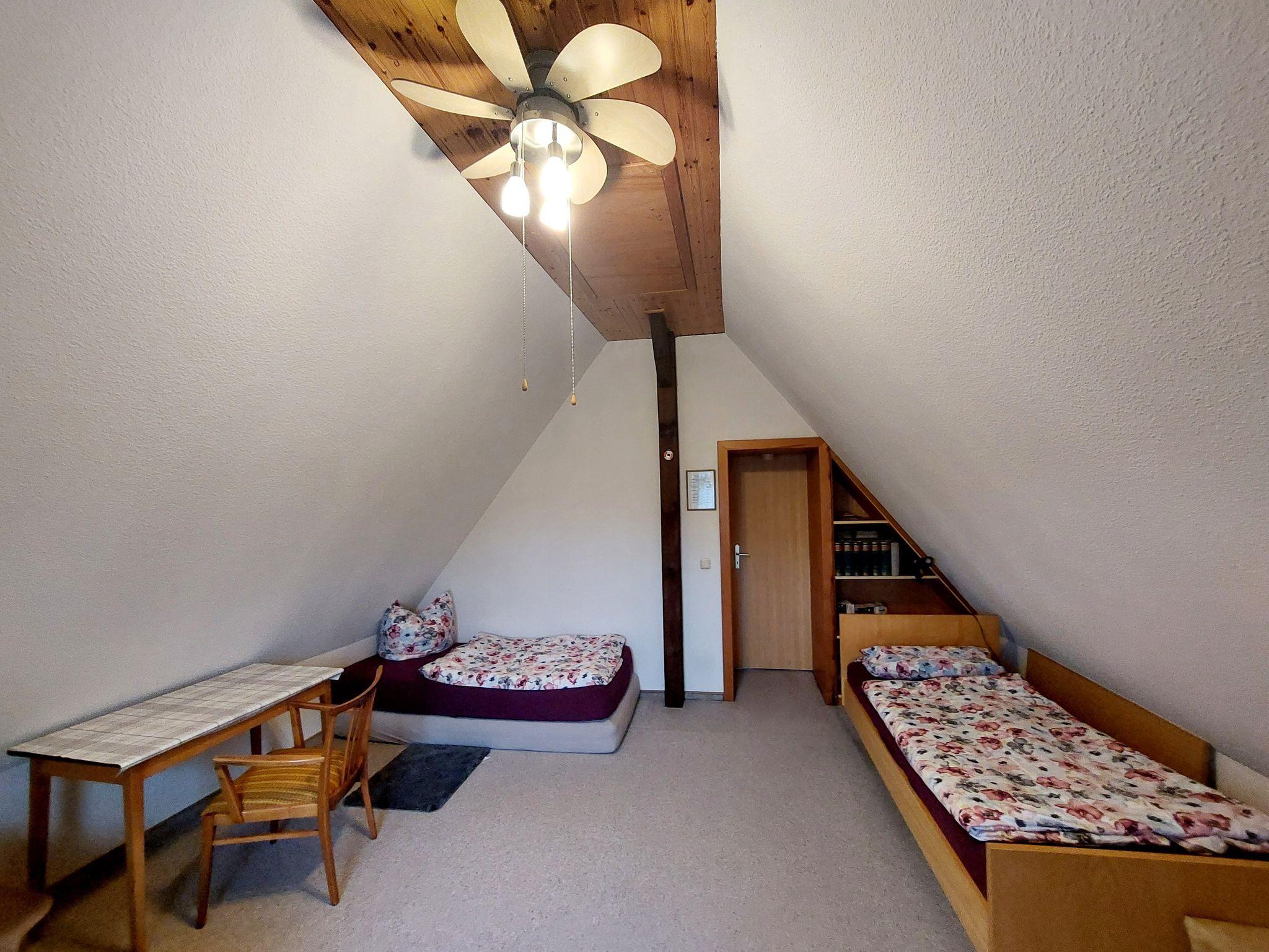 Der zweite Schlafraum befindet sich im ausgebauten Dachgeschoss und ist über eine schmale