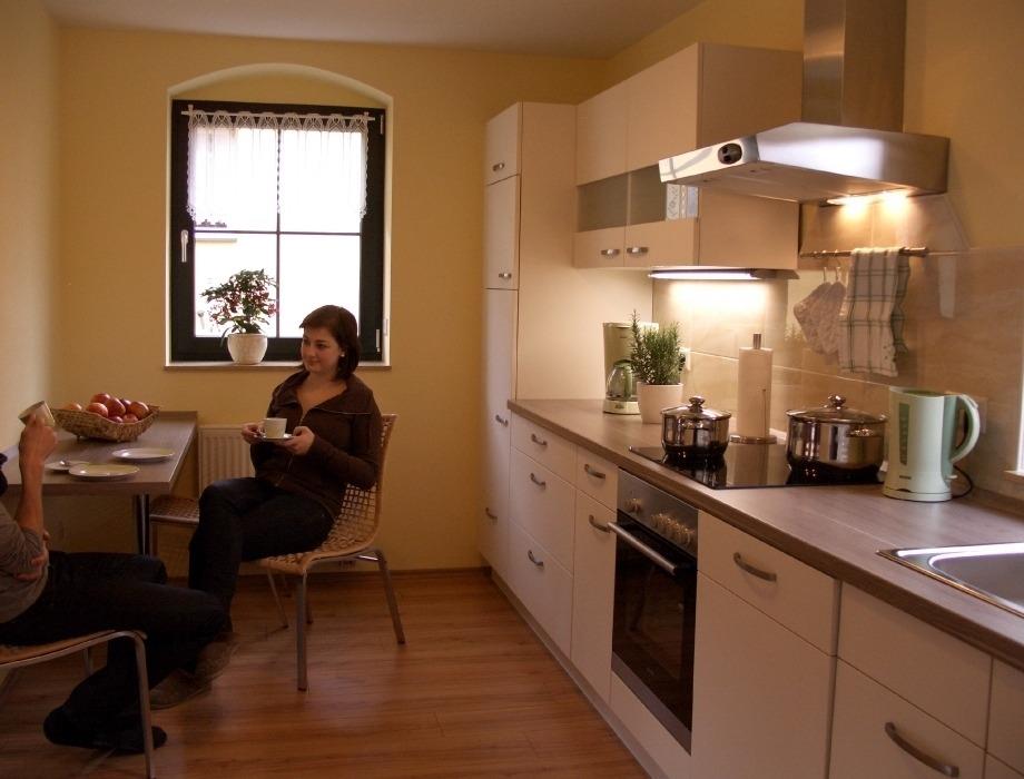 Wohnküche mit Ceranfeld und Backofen, Kühlschrank/Kältefach, Kaffemaschine, Toaster, Wasserkocher, Mikrowelle