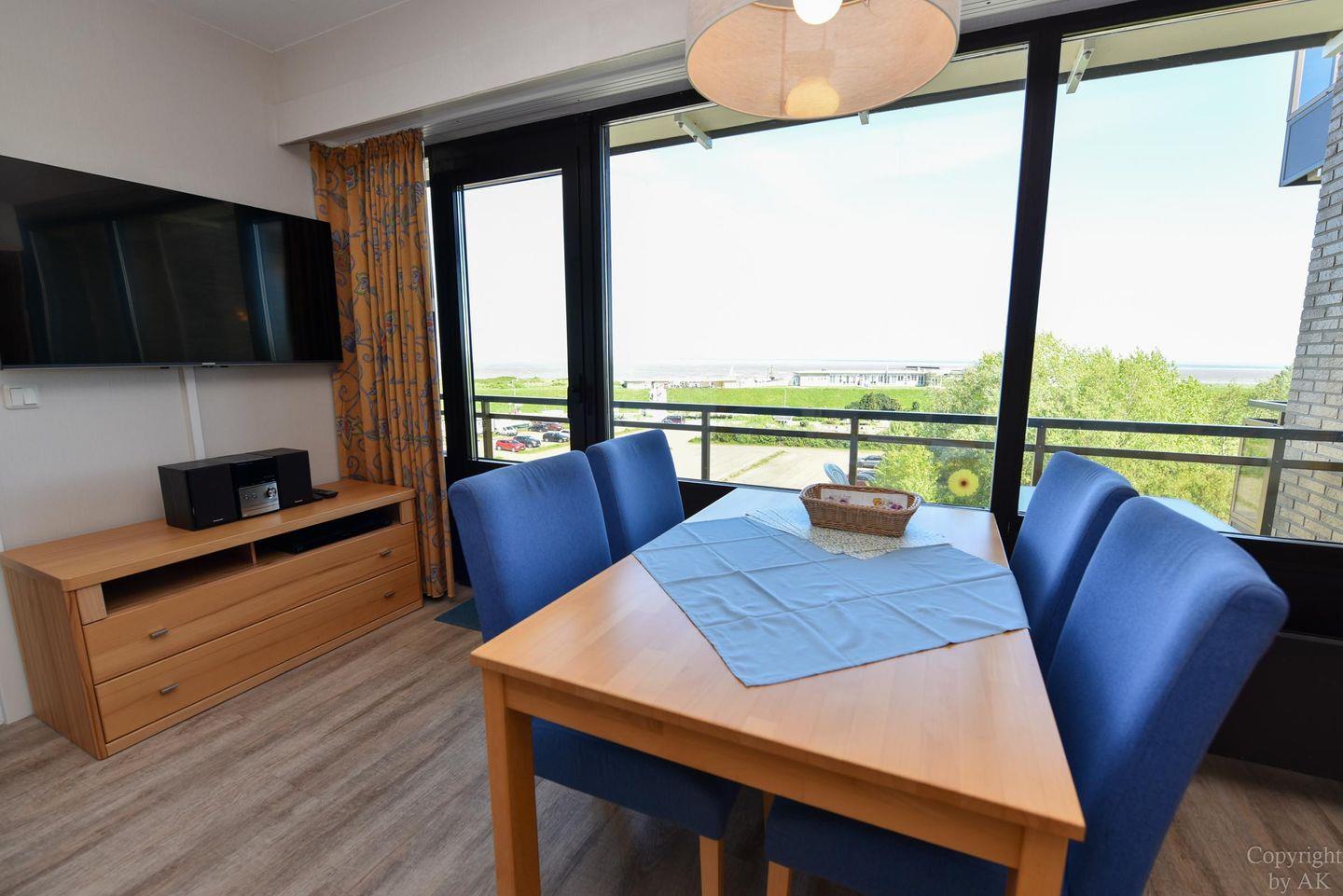 2 Zimmer-Appartement im 4. OG mit Panorama Seesicht auf den Weltschifffahrtweg und eigenem Strandkorb (nur noch in der Saison 01.05.2026-30.09.2026) am nur wenige Minuten entfernten Strand von Döse. Die Wohnung verfügt über einen komplett ausgestatteten großen Balkon zur Seeseite. Der Wohn-/ Essbereich ist mit Vinyl-Belag ausgelegt und mit einem Sofa, einem Sessel sowie einem Esstisch mit 4 Stühlen ausgestattet. Es gibt Kabel TV sowie einen DVD-Spieler und eine Stereoanlage. Im Schlafzimmer befindet sich ein Doppelbett. Das Appartement hat eine kleine Küchenzeile und ein WC/Duschbad. Der kostenlose Tiefgaragenstellplatz hat eine Einstellhöhe von 1,49 m. Der Eigentümer stellt seinen Gästen aber auch einen Parkausweis für den städtischen Parkplatz vor dem Haus zur Verfügung. ( 01.01.- 31.12.)