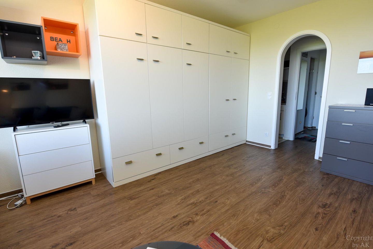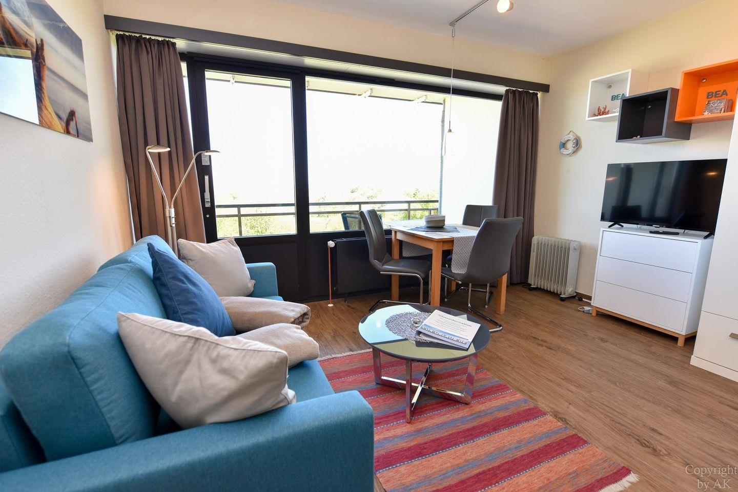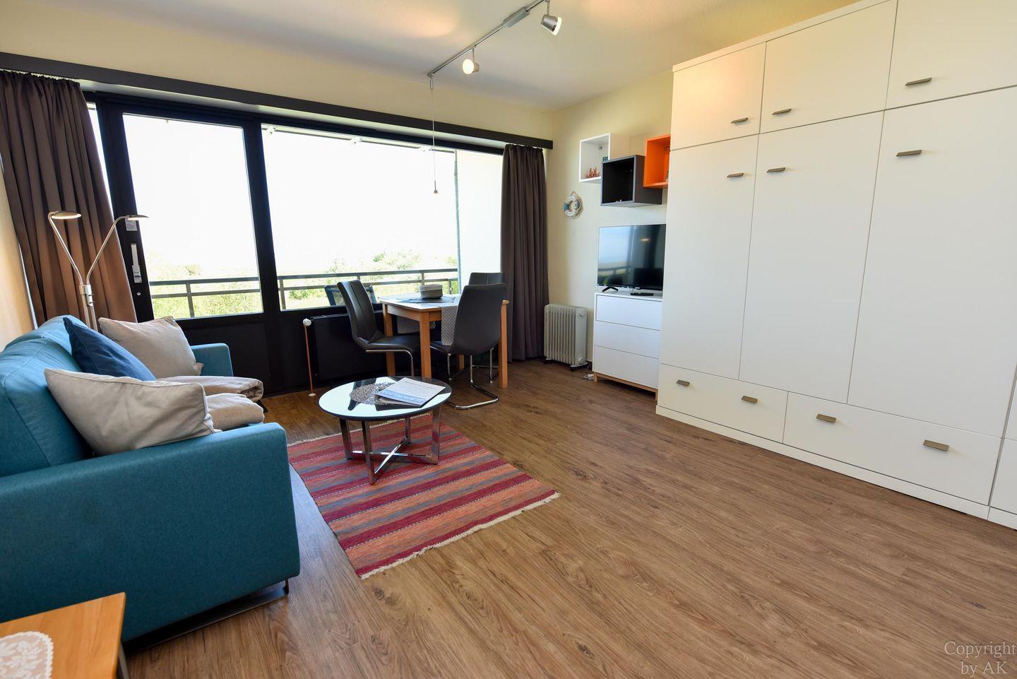 1-Zimmer Ferienappartement im 4. OG im Haus JAN AM STRAND mit großem Balkon und toller Seesicht auf den Weltschifffahrtsweg und das Weltnaturerbe Wattenmeer. Komfortable eingerichtetes Appartement für 2 Personen, mit moderner Küchennische. Im Wohnbereich befindet sich ein Schrankbett , ein Sofa sowie ein Tisch und 2 Stühle. Das Duschbad ist neu. Der Tiefgaragenstellplatz hat eine Einstellhöhe von 195cm.
