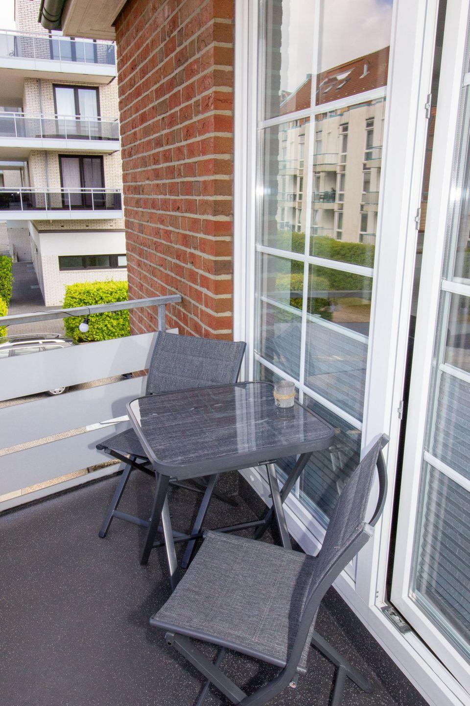 Vom Wohnbereich gelangen Sie auf den sonnigen Balkon mit Blick in eine ruhige Sackgasse. Perfekt für entspannte Nachmittage und laue Sommerabende.