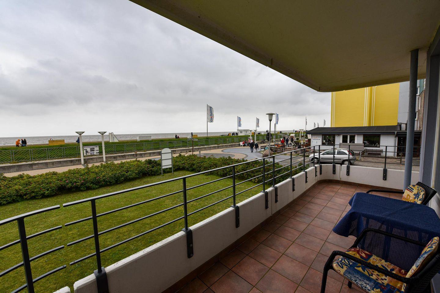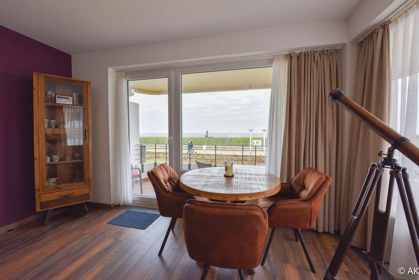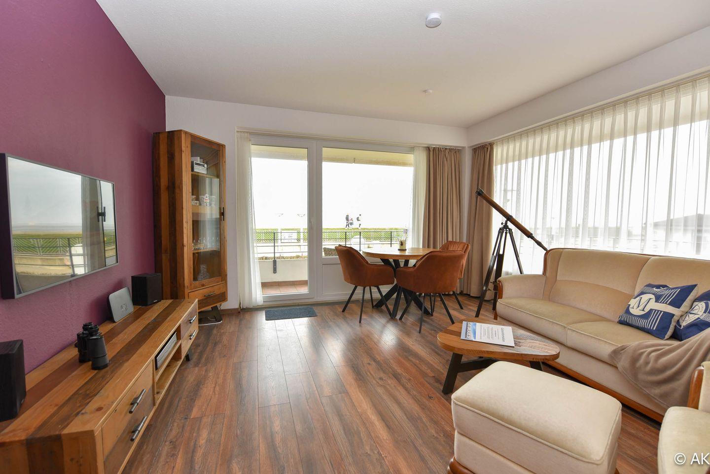 Die 3 Zimmer Eckwohnung Nr. 8 mit separater Küche und Balkon im Haus "Nautilus" liegt im Hochparterre und hat eine direkte Seesicht auf das UNSECO Weltnaturerbe Wattenmeer sowie den Weltschifffahrtweg. Die Wohnung ist aufgeteilt in ein Wohnzimmer, Küche, Schlafzimmer mit Doppelbett und ein Schlafzimmer mit einem Boxspringbett sowie einem Bad mit Dusche und WC.